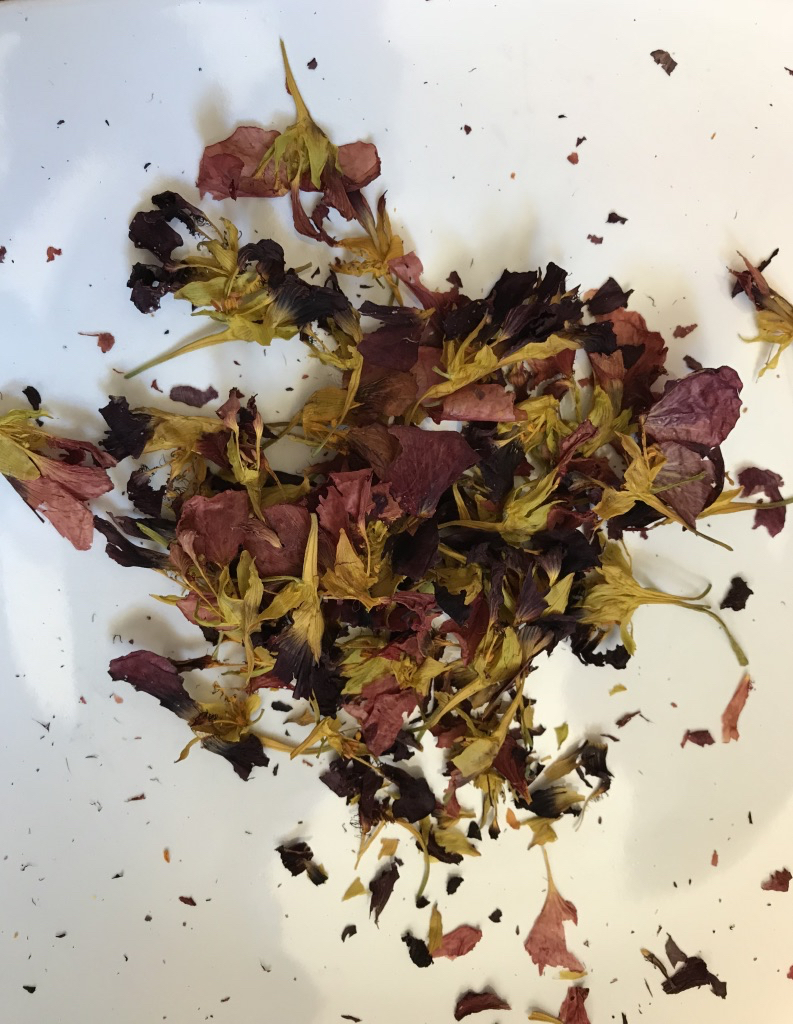 I have a 10 tier Stockli electric dehydrator. It’s more cost efficient to use all 10 tiers so I put more watery things towards the bottom (tomatoes, apples, pears) and the herbs, leaves and flowers in the higher tiers. The herbs take much less time than the fruit and veg, so I remove those and replace with fresh herbs/flowers/leaves – so I can often get three or even four different loads of herbs/flowers/leaves dehydrated in the time that it takes to dry sliced tomatoes, for example.