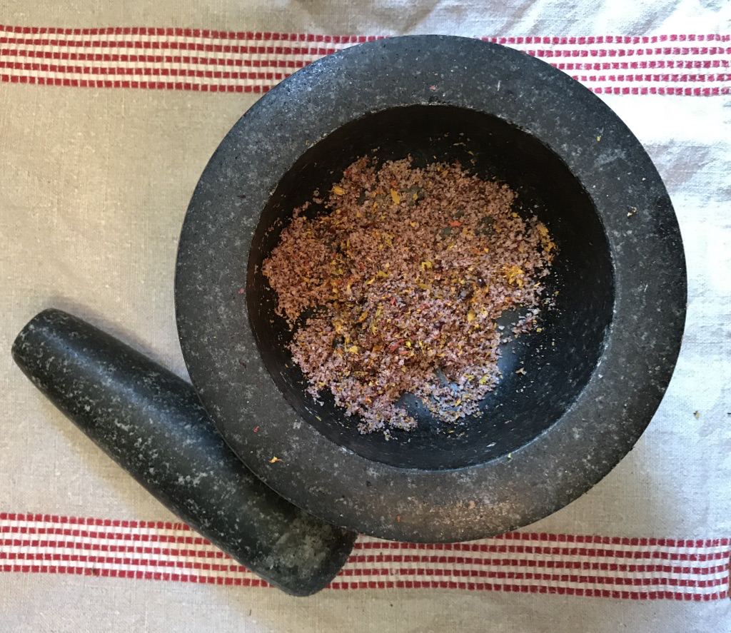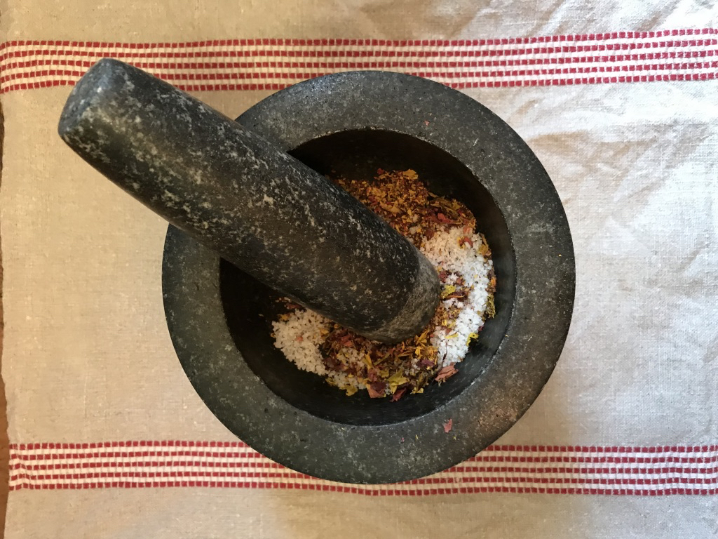 Here I used fine sea salt. If the salt you’re using is a bit lumpy, crush it first in a pestle and mortar (or with a wooden spoon in a bowl, or whizz in a blender) to make it finer.