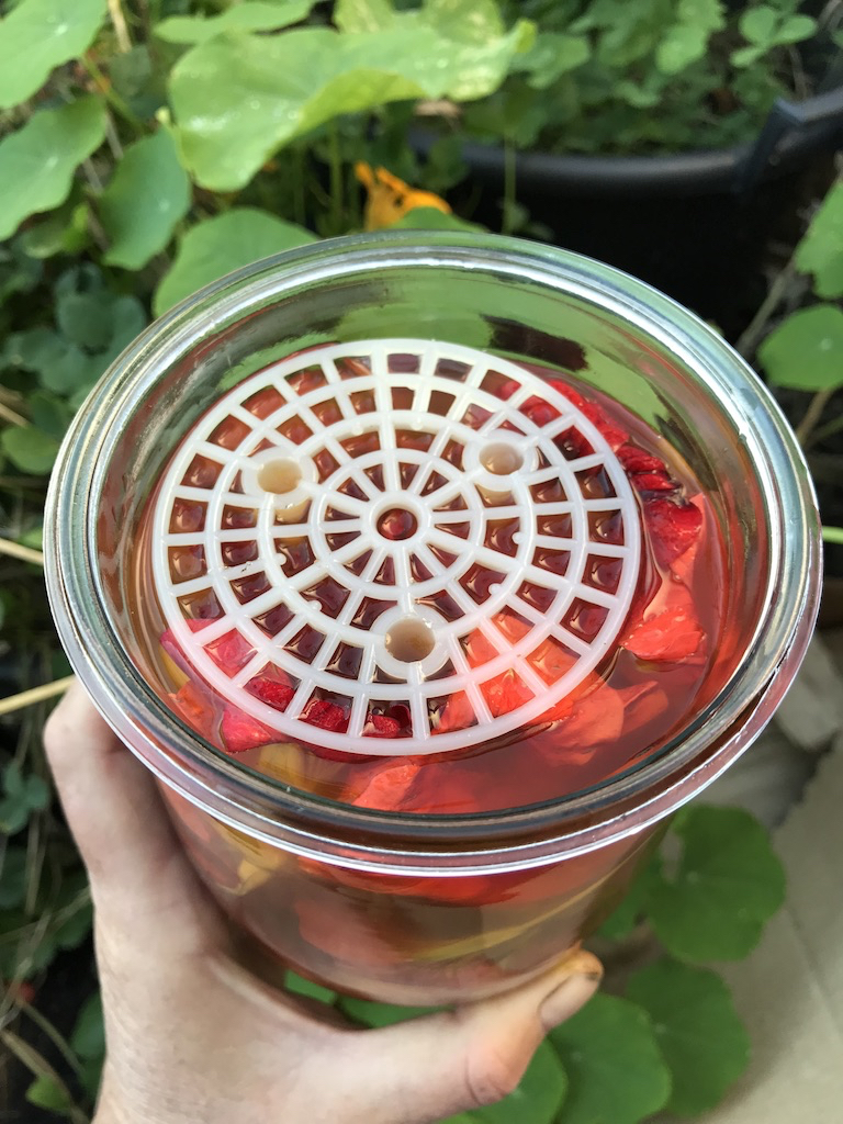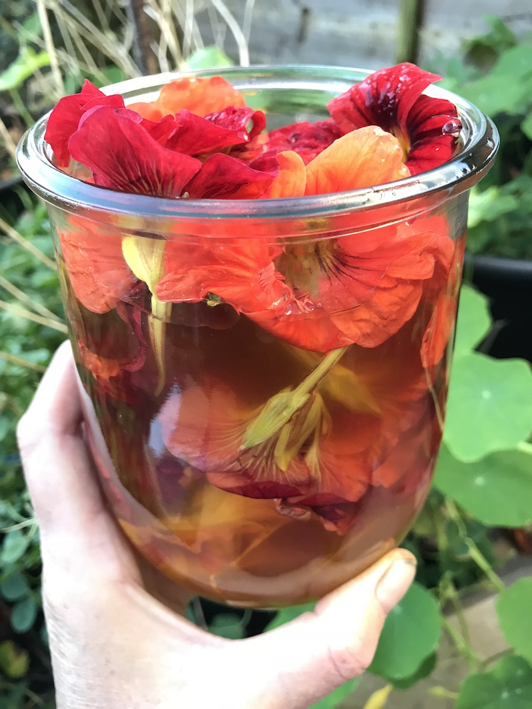 Take your jar into the garden and loosely fill with nasturtium flowers, shaking each one first to dislodge any aphids. Then fill with vinegar, pop the preserving weight on top* (a piece of greaseproof paper folded to fit will do the trick too) and replace the lid.