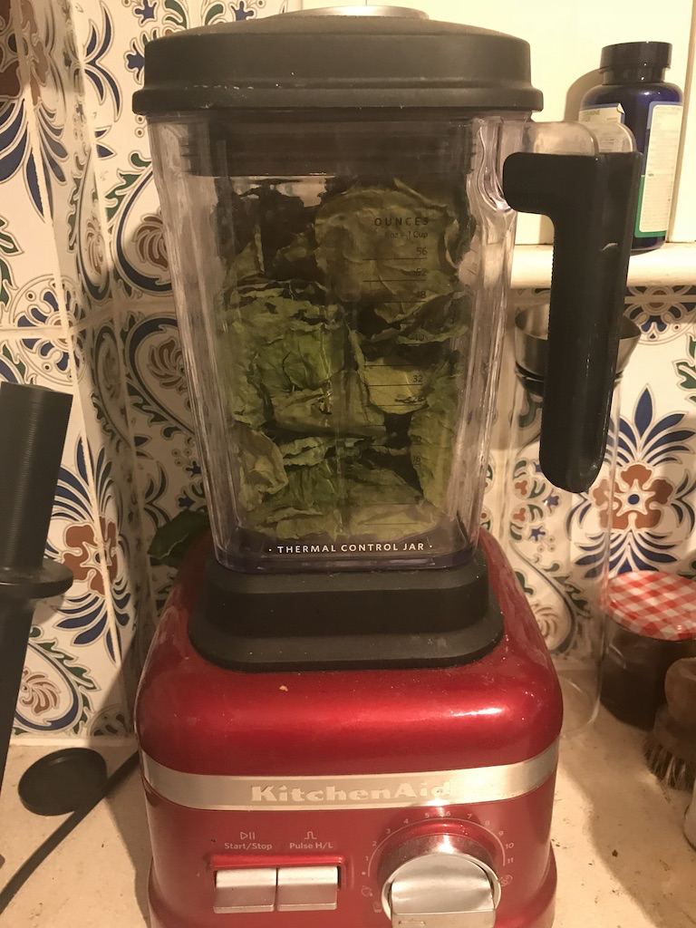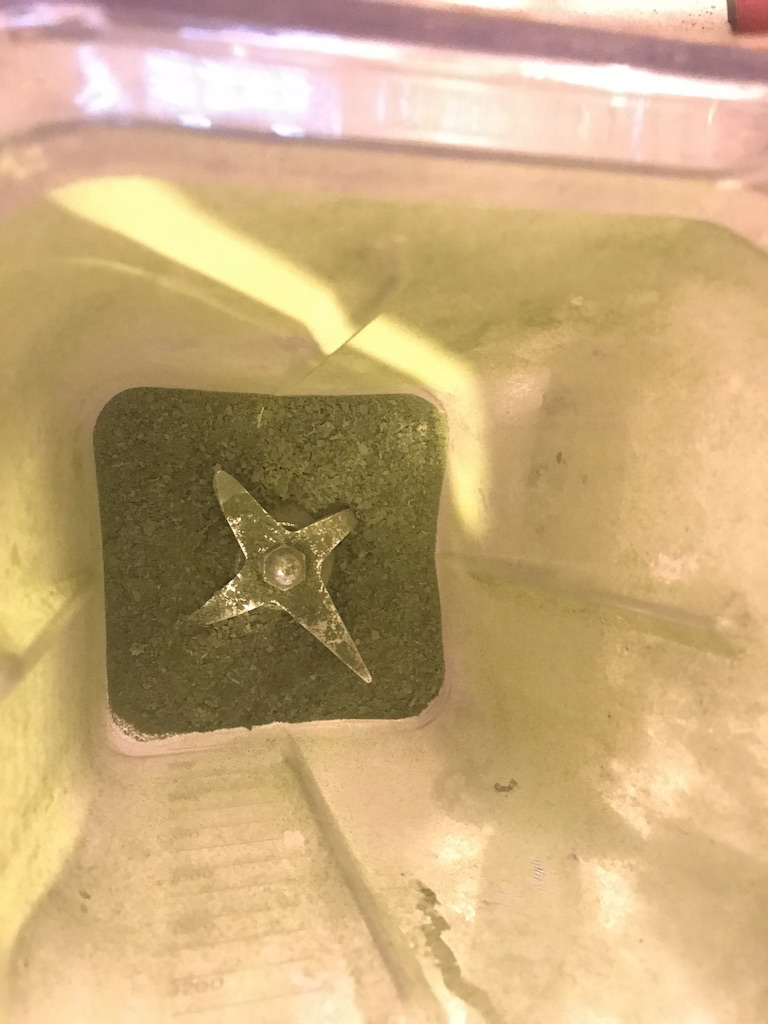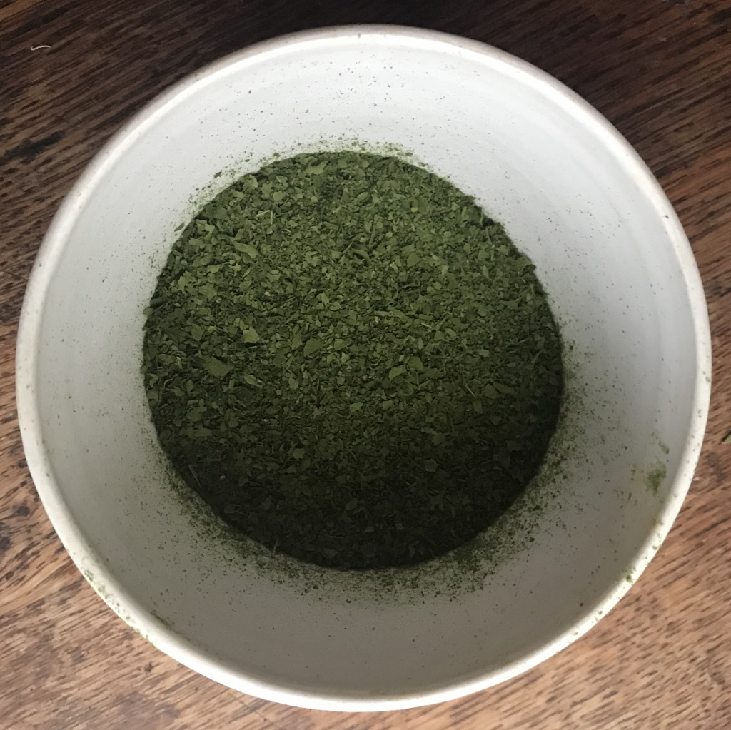 Now you need to reduce the leaves and /or flowers to a powder. You can do this in a blender or food processor, in a pestle and mortar, or crush with your fingers. It doesn’t need to be perfect.