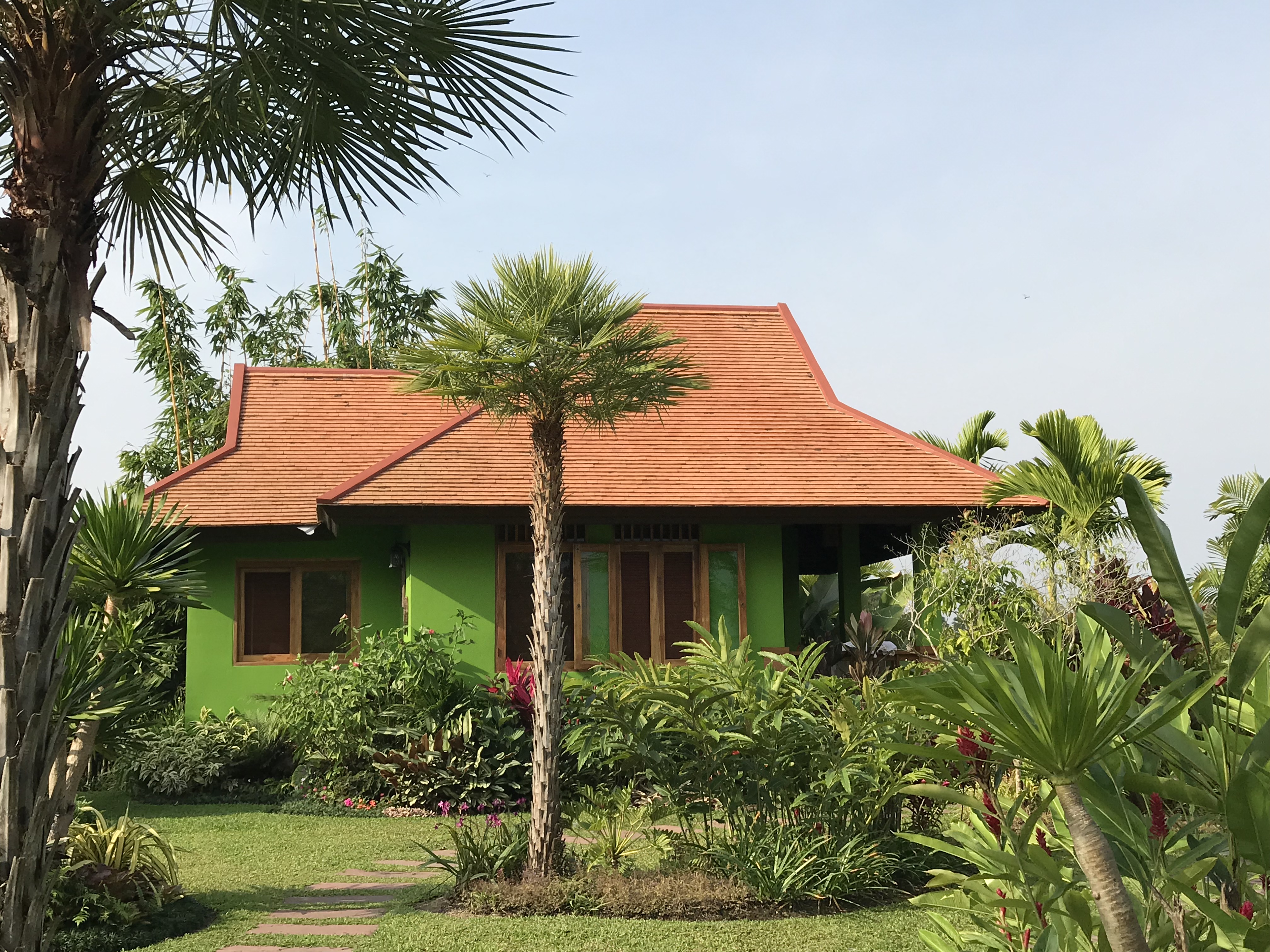 My table is between two ponds, both filled with fish. Dad saw a huge python in the pond, as thick as my arm, recently. Behind in the rice fields, a tractor is ploughing ready for the next sowing – traditionally this would have been done with water buffalo and there are still buffalo in some of the fields in the village. The gardens are filled with birds, huge bees, dragonflies, lizards, gecko and enormous butterflies, enjoying the abundant vegetation and vibrant flowers, such a joy to see. I am loving the warmth. Before I left the arthritis was doing the fandango in almost all of my joints, after 24 hours here I was arthritis pain free.