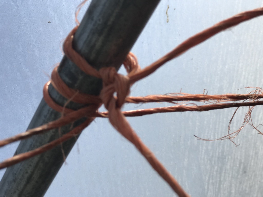 We use baler twine, mostly because I have a huge spool of it so Charles and I share it. It lasts for several years – some of mine is at least 5 years old – Â and as we already have some, it would be a bit daft not to use it. However if I were setting up a tunnel now I would look for viable natural alternatives. Cheaper natural fibre strings rot and snap, so choose a thicker product which will last the whole season.