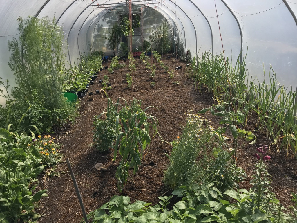 It’s also a time of letting go of overwintered plants in the polytunnel to create space for summer cropping veg. Before I went to Ireland, I cleared, mulched and replanted the polytunnel – and quite a lot of outdoor planting too. Here in Somerset, mid to the end of May is an ideal time for planting undercover spaces with the next season’s plants, as there should be no frosts. Further north, timings need adjusting by a week or two. Weekend work commitments and my week long trip to Ireland on Sunday 19th gave me a deadline of Friday 17th to get everything I could planted up.