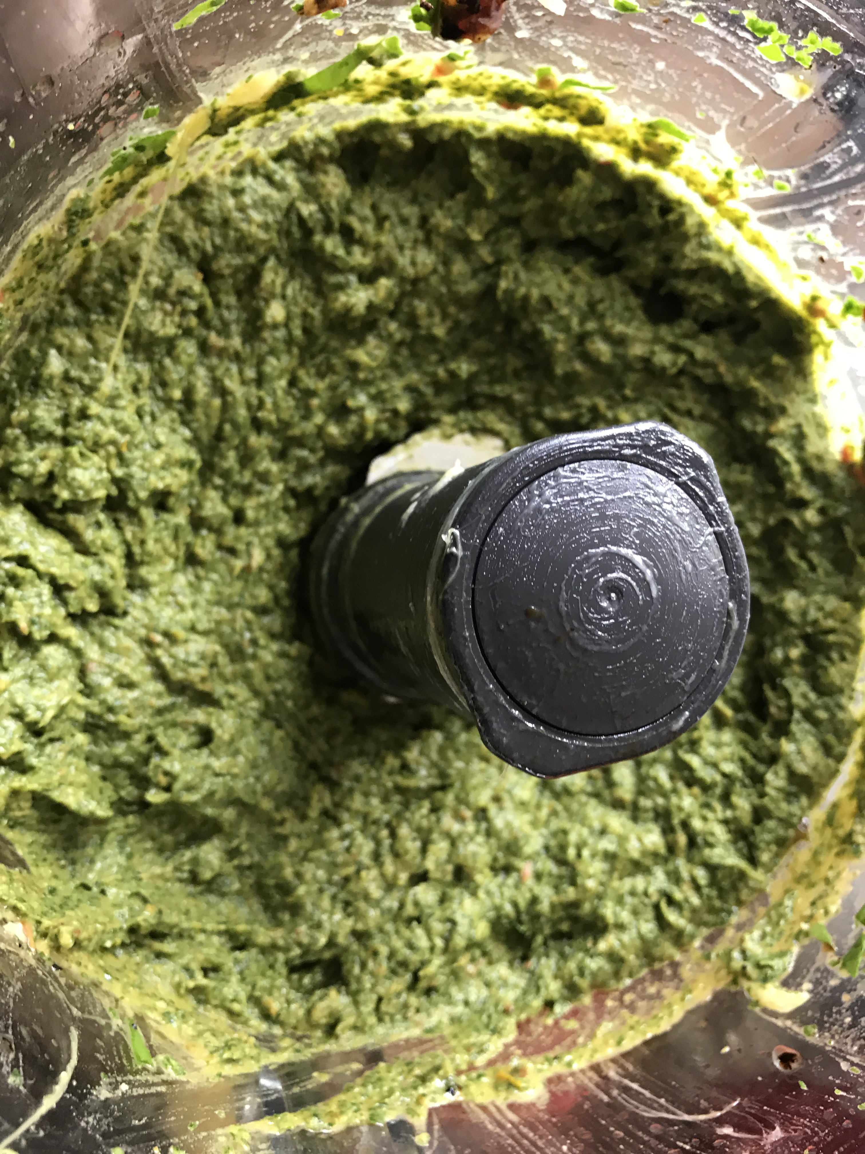 Put the beans, tomatoes with the soaking liquid, lemon juice, basil and spinach into the food processor. You may need to add the spinach a little at a time.