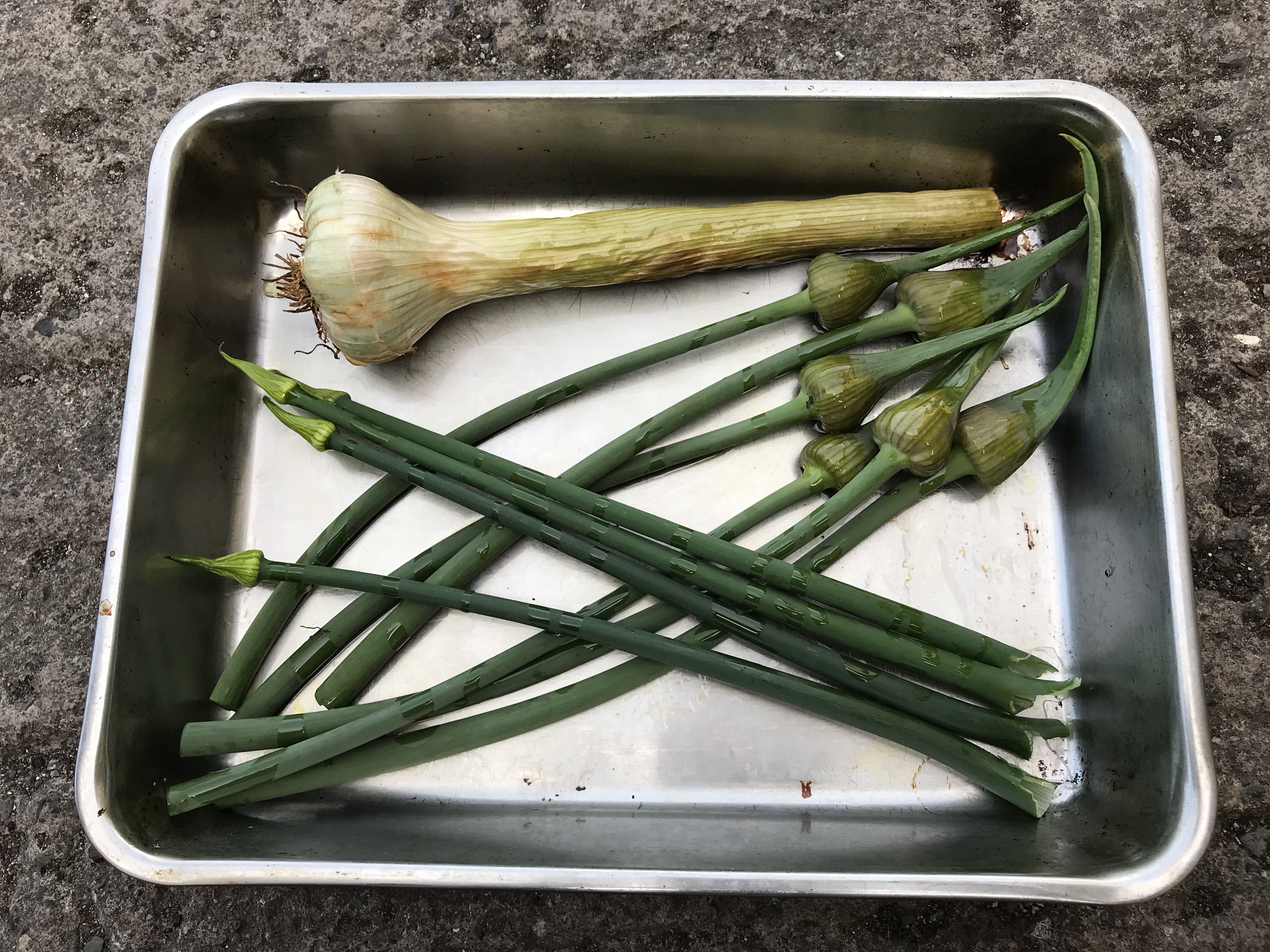 You just cut off the flowering part of the garlic and leave the rest to grow on. If you left the flower then the garlic wouldn’t be good for using as all of the plant energy would go into the seeds so it is a win:win situation 🙂