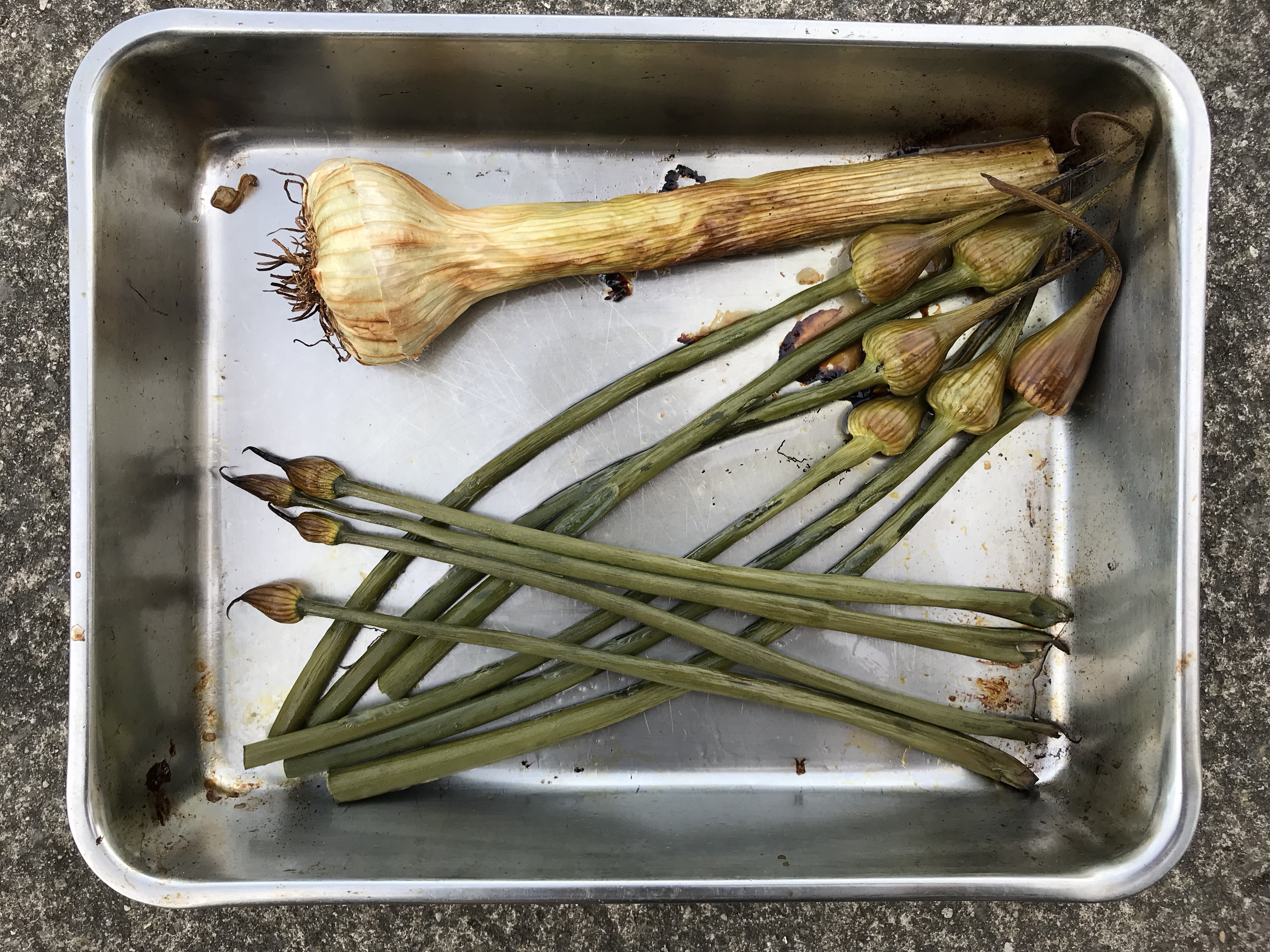 Heat the oven to 180ËšC (350ËšF). Place the whole green garlic in an oven proof tray, drizzle with olive oil and cook for about 10 minutes. Then add the scapes – mine were from elephant garlic and spring onions – to the pan and return to the oven until cooked – another 5 minutes or so. Leave too cool.