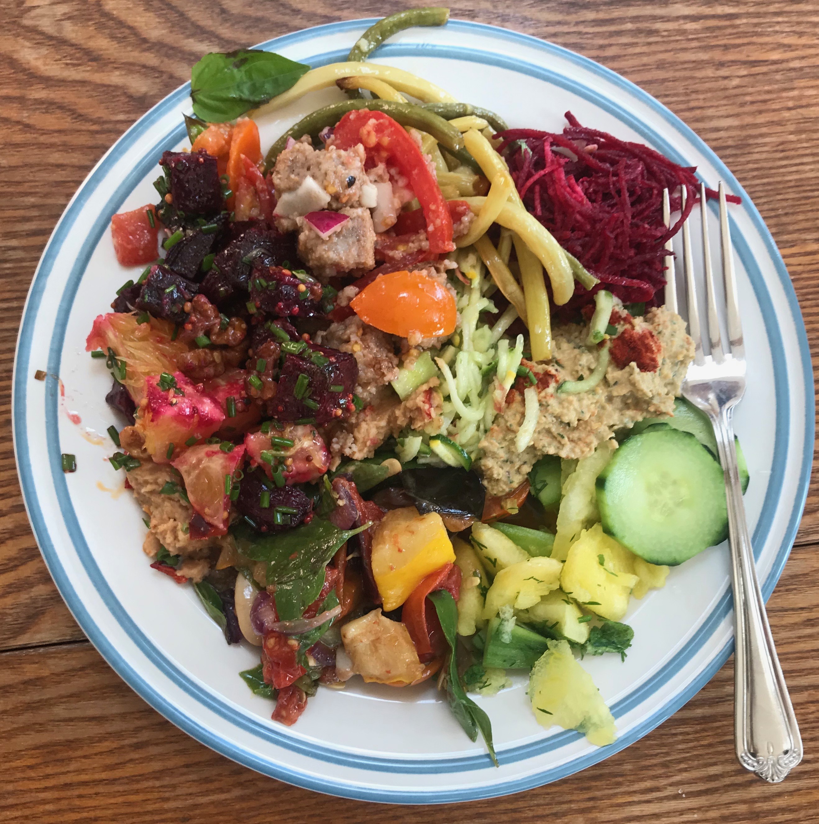 Then I was mostly away on a speaking tour, coming home on the Wednesday to co-run a course at Homeacres with Charles. Here’s what I made, all home grown (recipes like this in The Creative Kitchen).