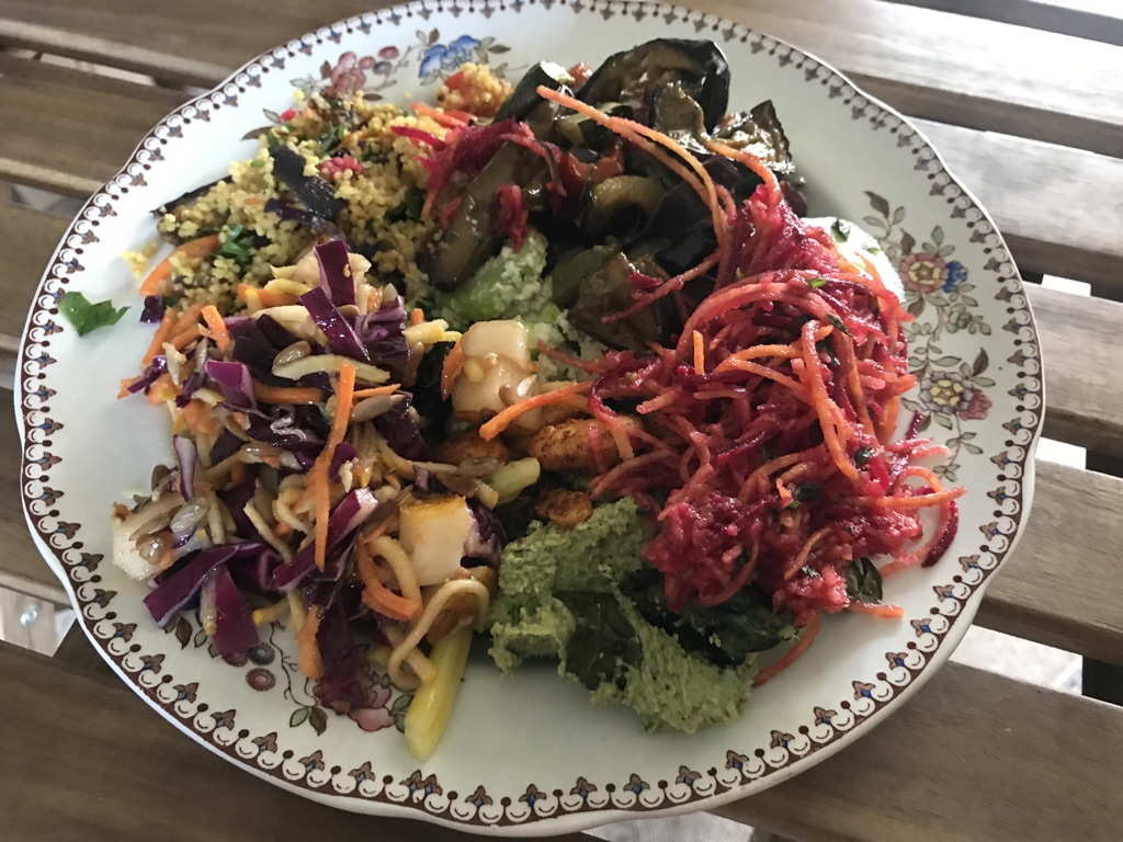 Here are the other dishes I made on the same morning for the course lunch – everything made from scratch using homegrown ingredients (as much as is humanly possible in the UK – we bought the chickpeas, olive oil, salt etc).