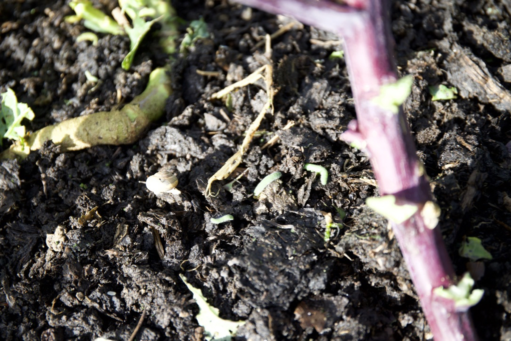 Over the past few days nighttime temperatures have dropped to well below freezing. In the polytunnel all tender plants have been killed off: the sweet potato vines, a few chilli peppers, the last aubergine. At the allotment, the nasturtiums are all dead, lying in a soggy heap. Yet who did I find munching on the flowering brassicas in the sunshine – caterpillars! They have found somewhere cosy to spend the cold nights, coming out to feast and sunbathe on their cabbages.