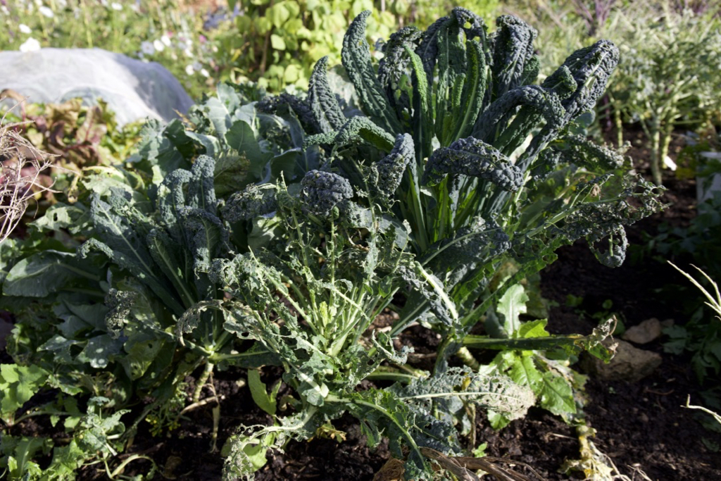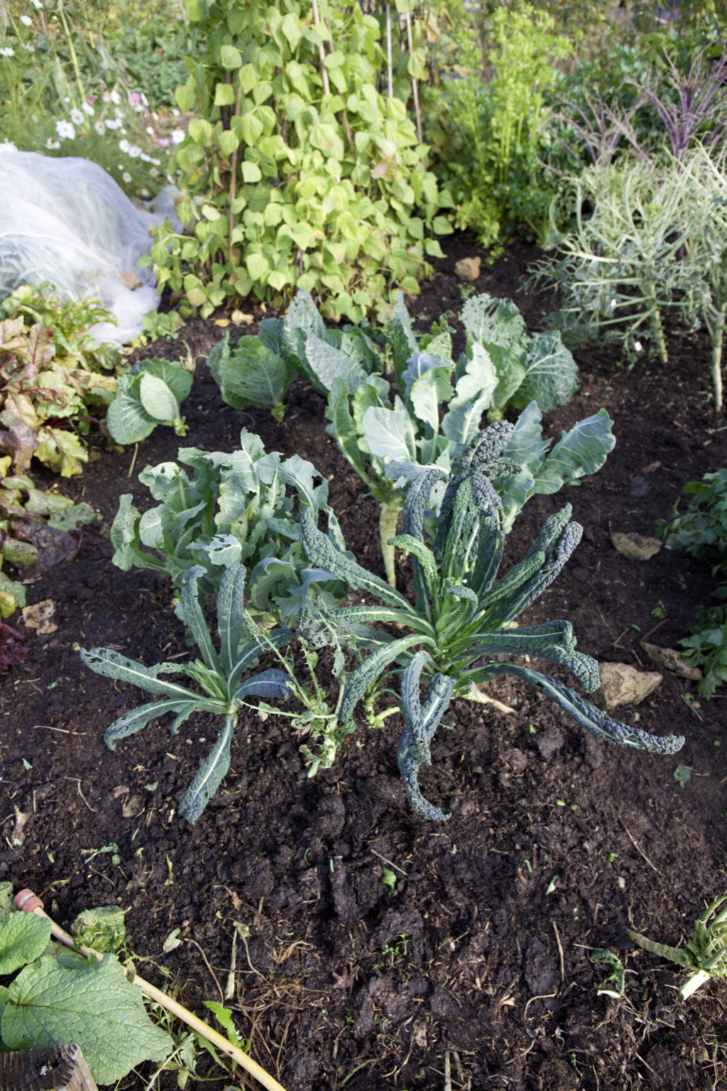 Lush, vibrant green leaves – beautiful healthy plants. I grow my brassicas under cloches covered with butterfly netting. This not only protects them from cabbage white butterflies and moths, but also from pigeons, deer and other wild things that visit the allotments. The netting has small holes so birds, hedgehogs and other visitors are unlikely to become tangled up in it. I keep the netting firmly attached with large stones or tent pegs.