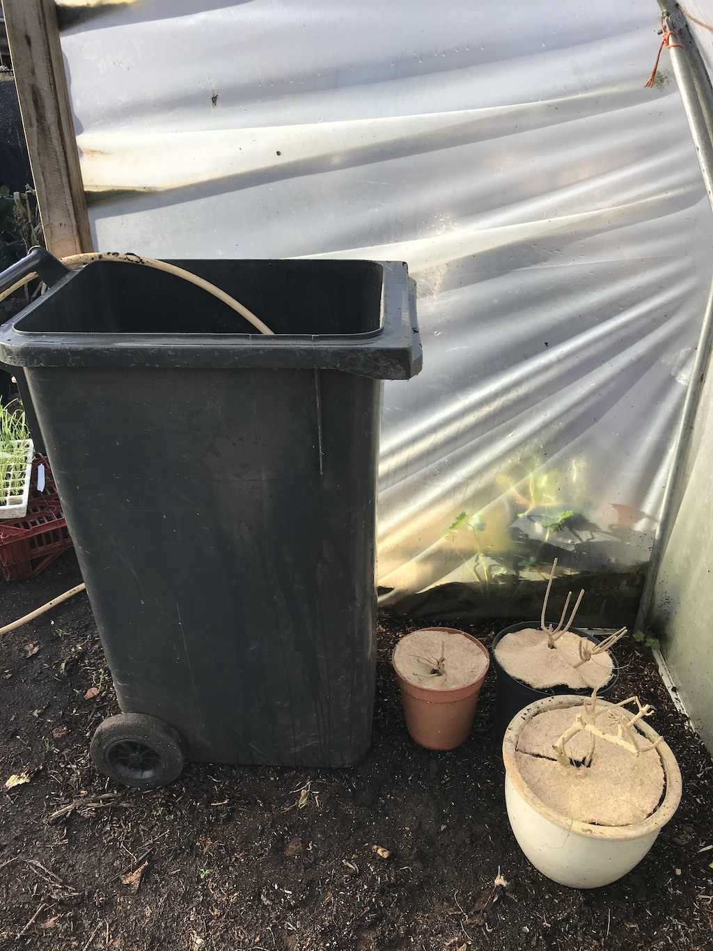 I filled the broken wheelie bin with water from the outside tap to use as a dipping pool for the winter. It also helps to make a cosy nook for these plants.