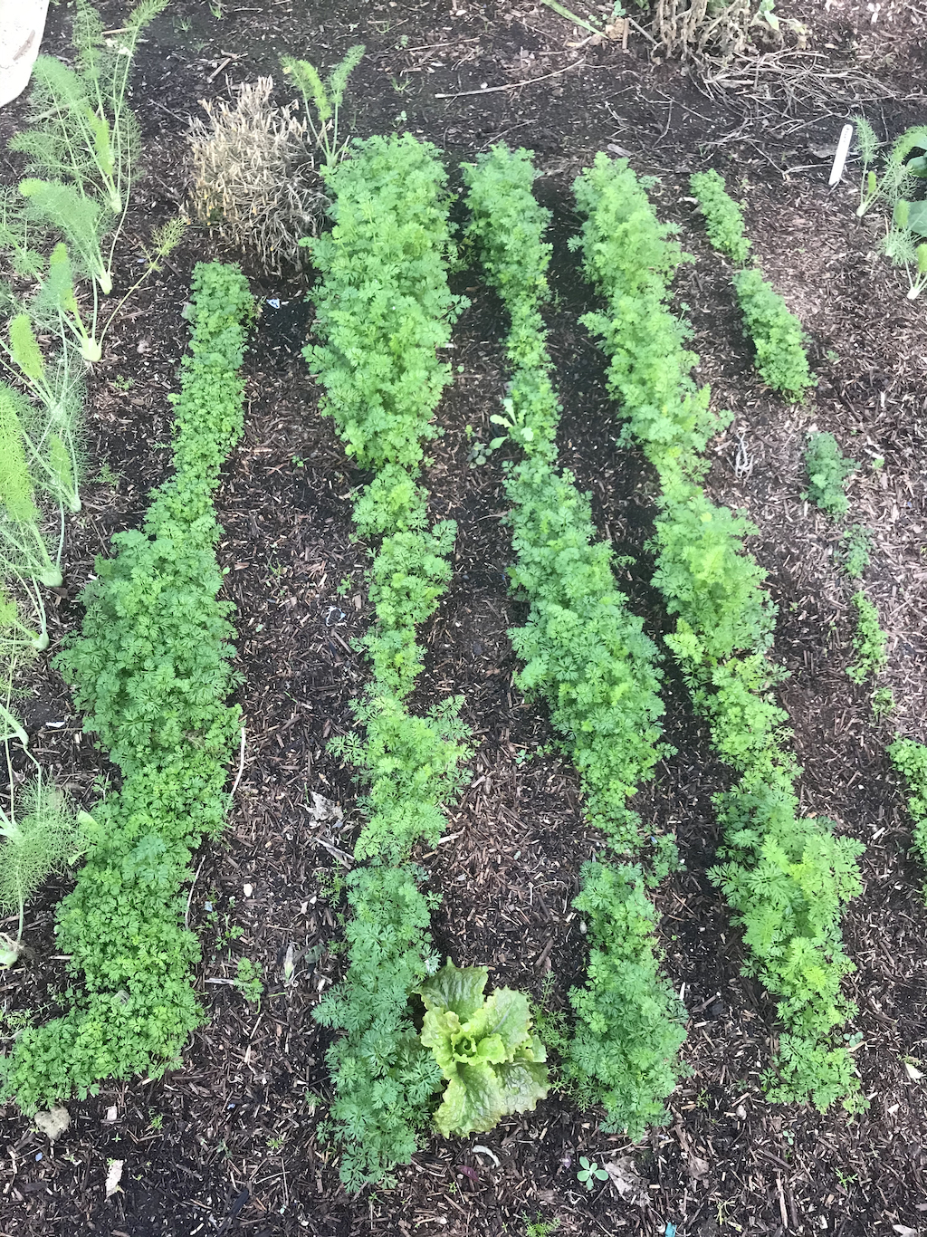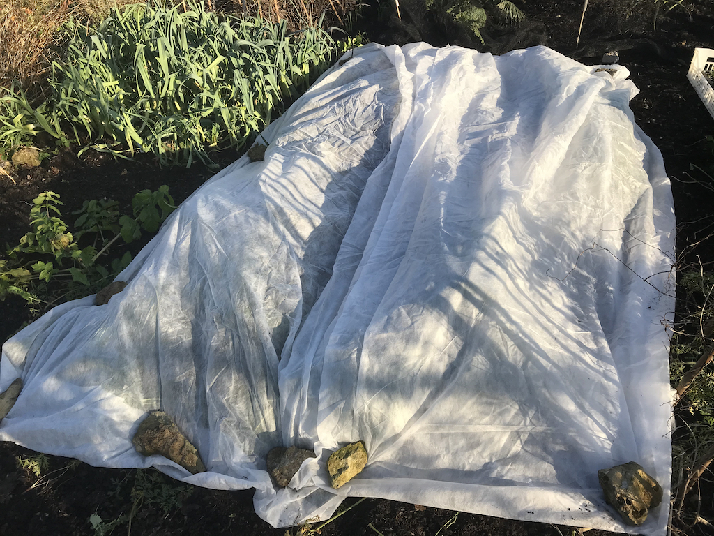 After harvesting, I “tucked up” the beetroot and carrots for winter, using two layers of horticultural fleece and then some enviromesh. I have had both now for around a decade, if you take care of crop protection it can last a long time. The enviromesh is to protect the fleece from any allotment visitors with claws. The holes are too tiny for anything to become tangled up in it. Everything has been weighed down with stones to prevent it from flying off in windy weather and also to enable anything curious enough to burrow underneath to get safely out! (I don’t actually want anything to burrow underneath, but neither do I wish to harm them.) This protects the veggies from very cold weather (even worked during the Beast from the East) and I can harvest from these beds right through to the spring when they will naturally go to seed.