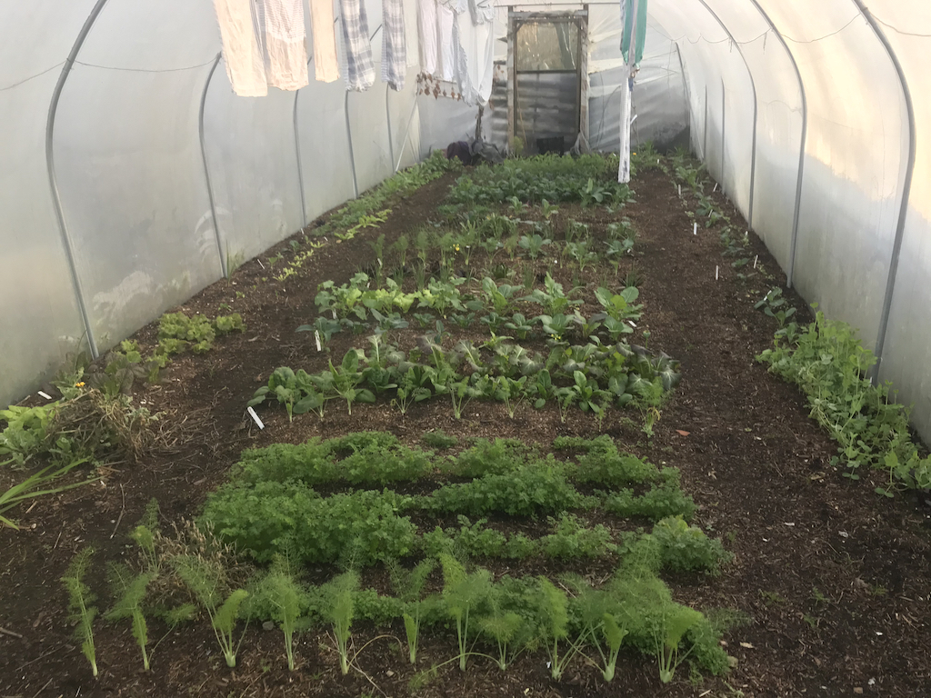 The polytunnel is full and abundant. As well as the veggies in the ground, in here I’m overwintering lemon verbena and other semi-tender herbs in pots and also some pots of daffodils for cutting, to bring them on sooner. All of the overwintering chillies and a couple of lemon verbenas too (I have a lot of that herb!) are on windowsills in the house where it is frost free.