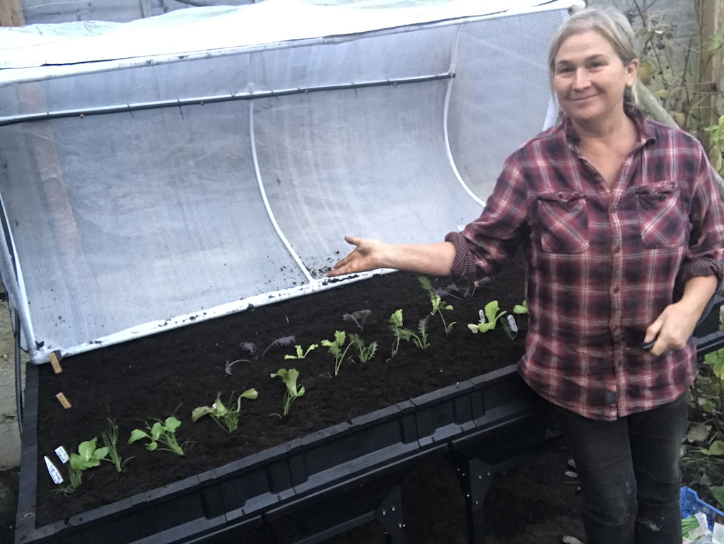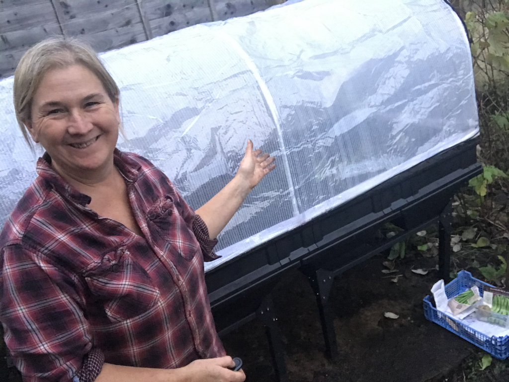 So, I mixed the different ingredients together and filled theVegepod, patting it all down every now and then to make sure that the compost will be firm for the plants. It needs to be filled right up to the top of the side panels. A final rake and then it was ready for planting. (Not the best photo of me, I haven’t quite got the hang of the bluetooth remote control!)