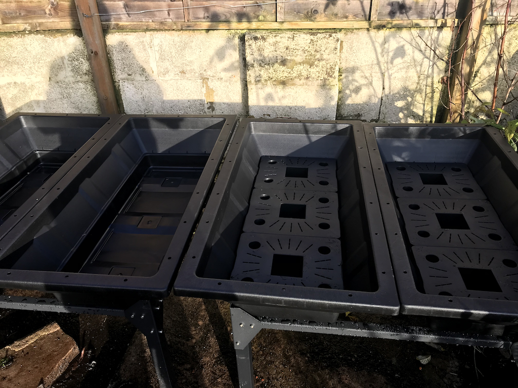 The cover fastens to the base with some strong clips. It now resembled a baby polytunnel on legs. Time to fill it.