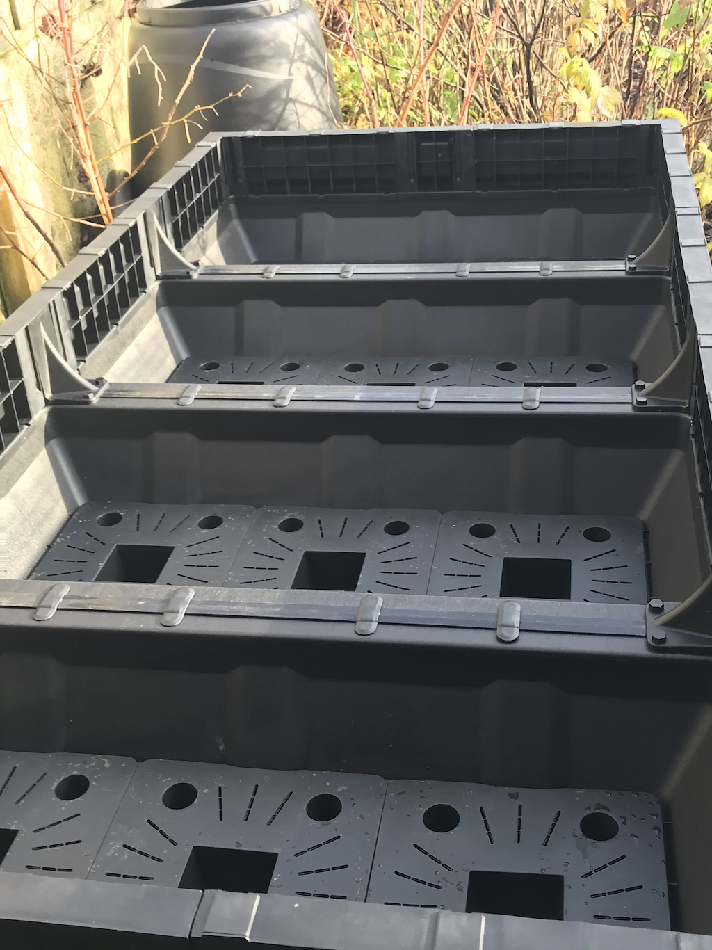 Next, I fastened the internal irrigation system to the top – my garden hose clips onto this and a sprinkler system waters the compost.