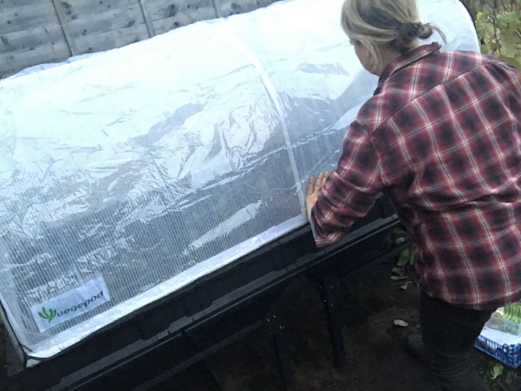 Then it was time to make the cover. This is very tricky on one’s own and I do advise getting someone to help if you can: Vegepod recommend two people, too. I didn’t have anyone to hand and succeeded – eventually – hurrah! But this part was rather stressful because the cover is large, which is fantastic from a growing point of view but not so much when you’re trying to manoeuvre it at only 5′ 6″ in a breeze…..