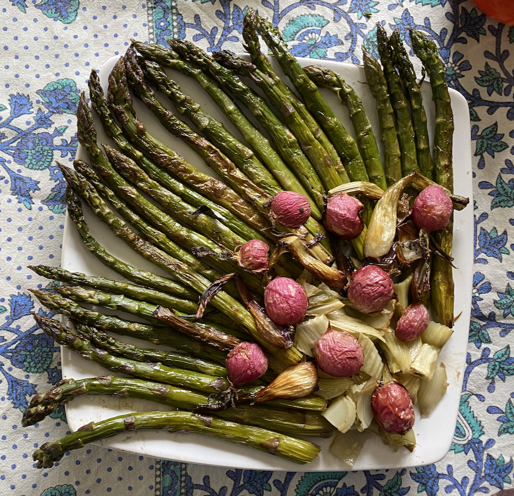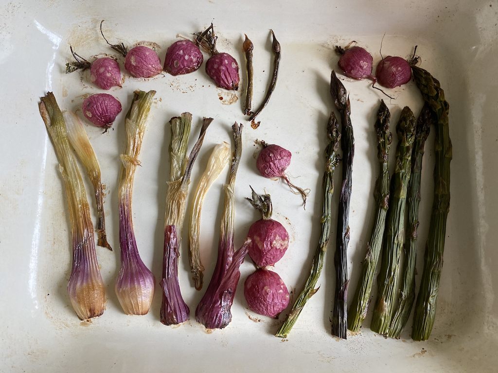 Cut the spring onions and radish in half lengthways. Arrange on a roasting tin with the asparagus, season with salt and pepper and drizzle with olive oil. Roast for 15-20 minutes until cooked.