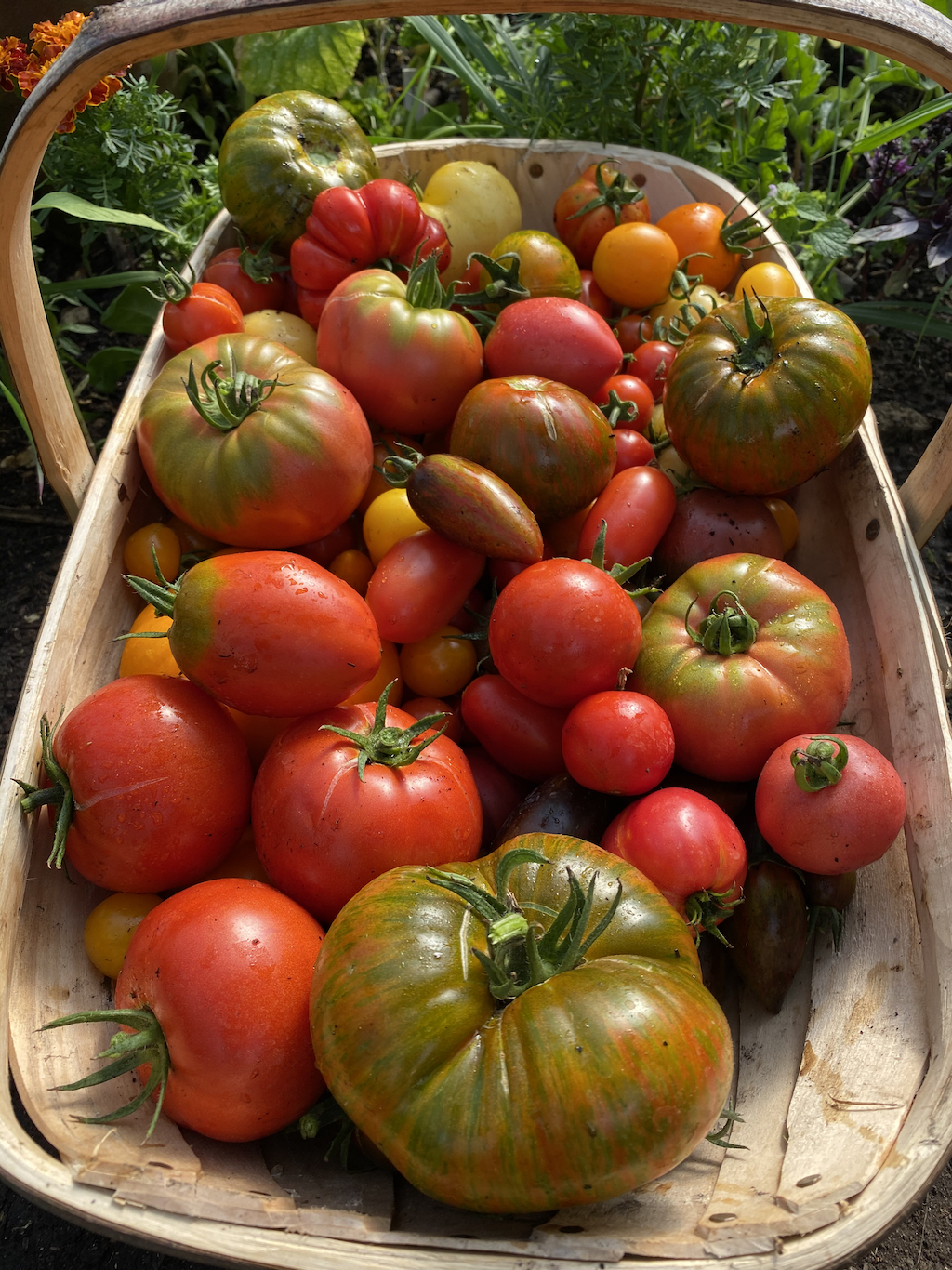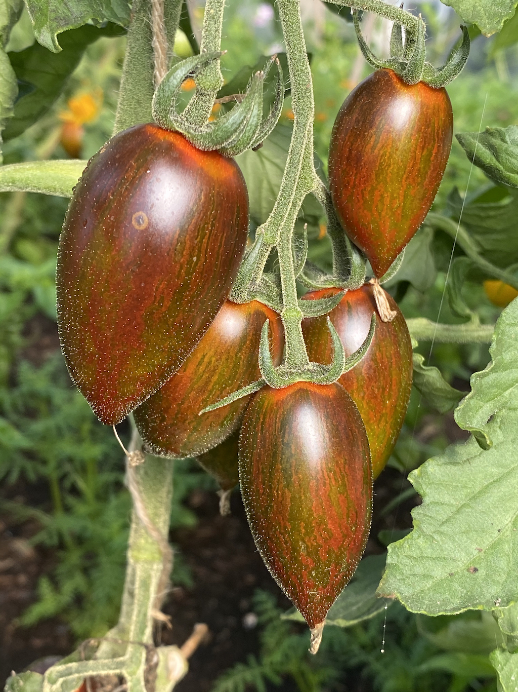 I’ve especially enjoyed Brad’s Atomic Grape tomatoes (see below) which shimmer in the sunshine, hold their shape when chopping and taste good too. They are open pollinated tomatoes, so I will be able to save their seed for next year.