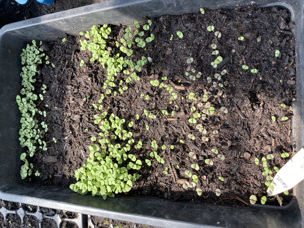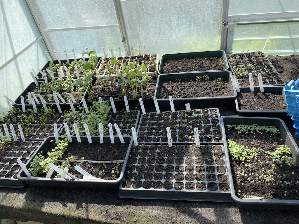 Three of these trays are herbs for microleaves – basil, dill and coriander. I want these quick crops for my preserving. There’s plenty of basil in the polytunnel but the recent hot weather has slowed it down a bit, so this is a back up. There are some videos on my Instagram account which explain all of the sowings here. Follow my account for regular updates and videos explaining how I grow food year round in my garden and allotment.