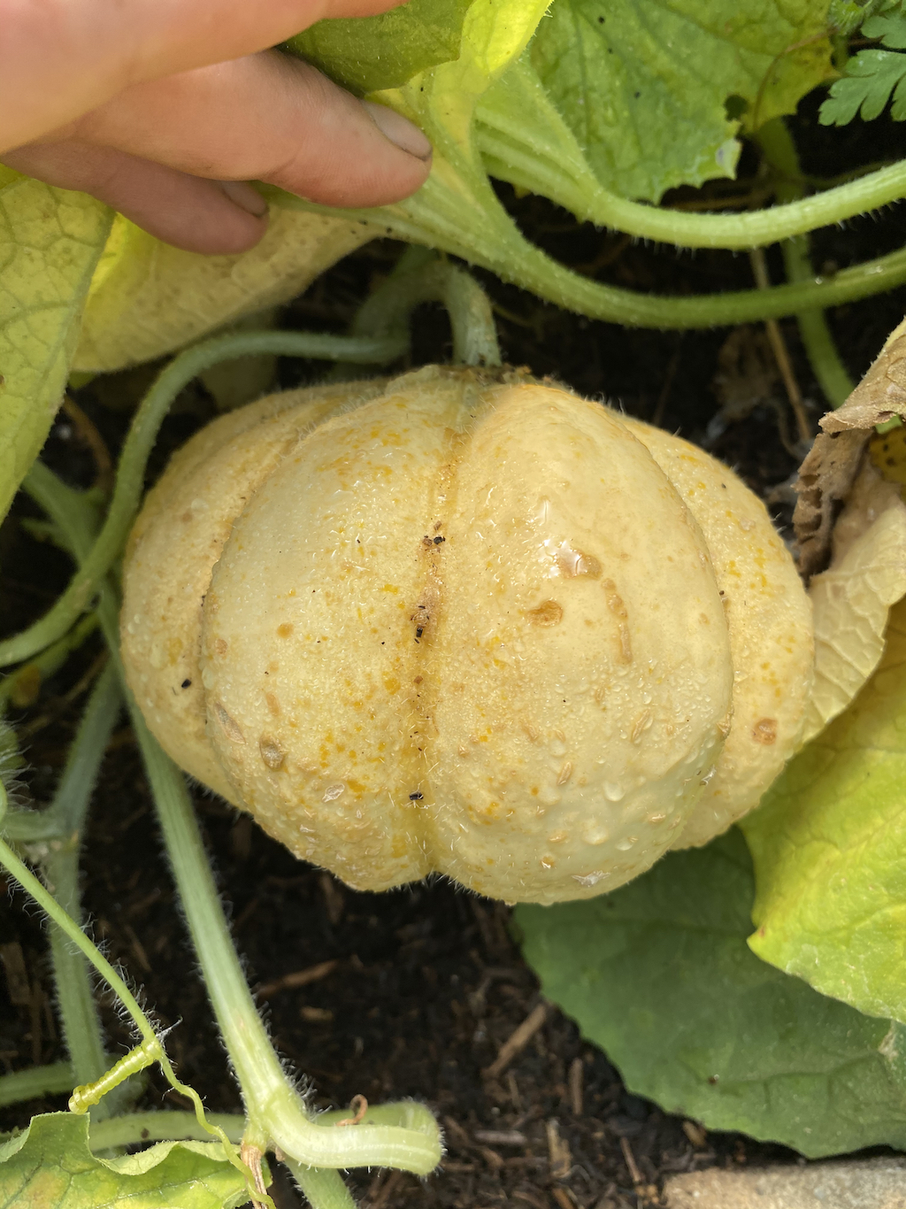 Every day I sniff my melons to see if they are ready! This is the way to check for ripeness. If the melon smells sweet and fruity, it is ready. I let the melons scramble across the ground and also provide stakes for them to climb up.
