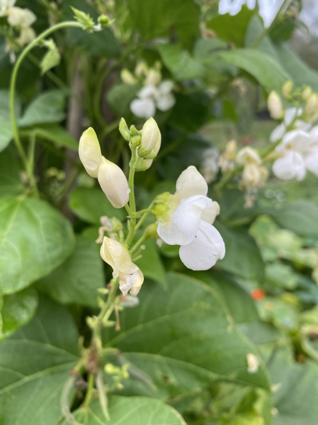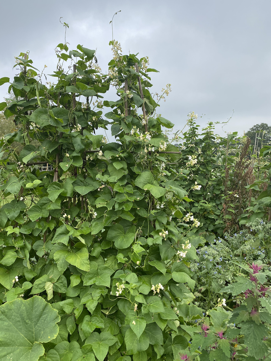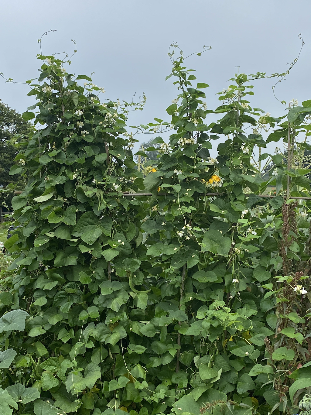 Many of the climbing French beans at the allotment are for drying, including Gigantes, Czar and Borlotti. They are surrounded by squash and different flowers, difficult to reach, but that doesn’t matter at the moment because I won’t be harvesting them until late September or October. French beans for eating fresh are growing nearer to the path.