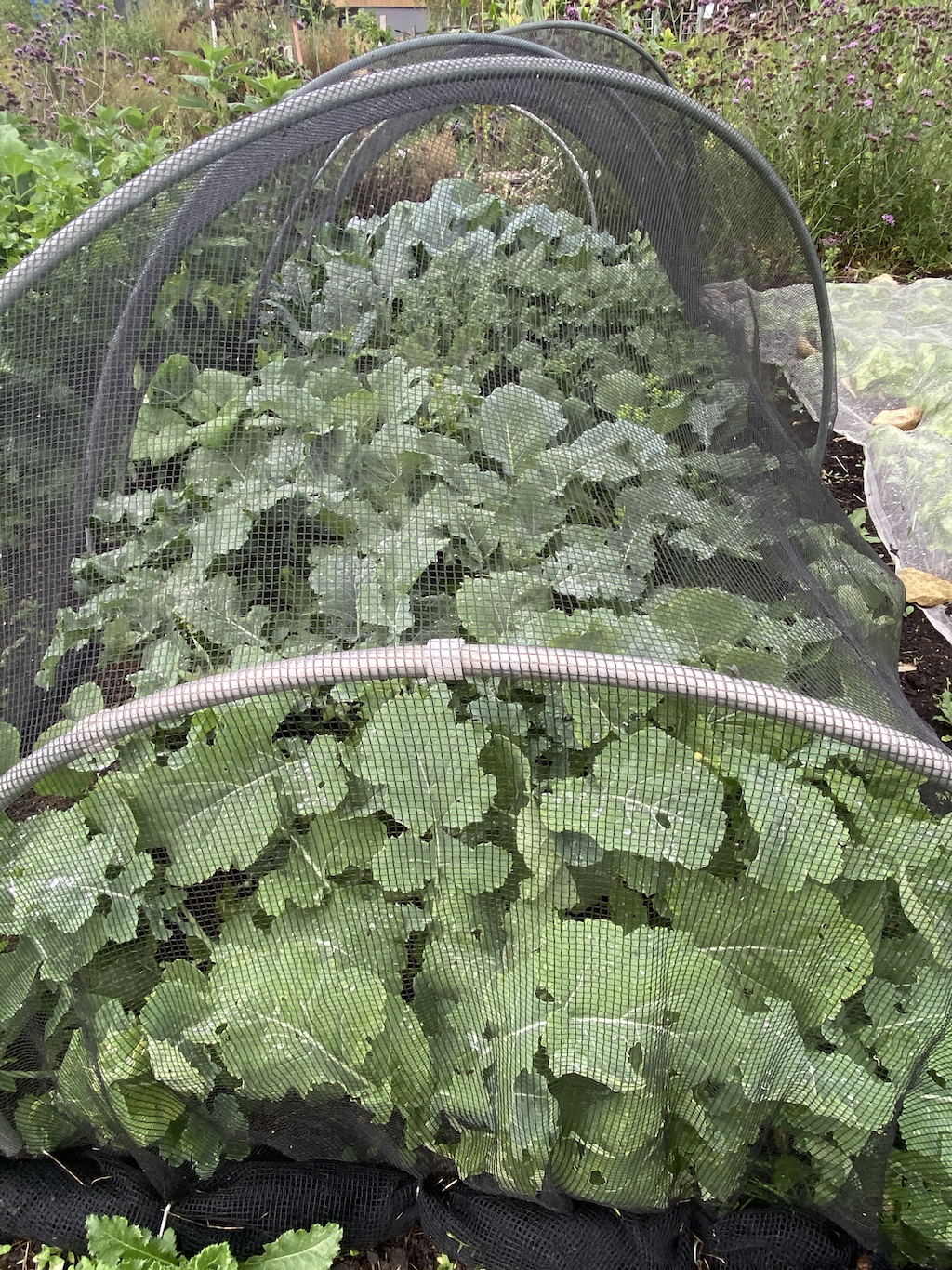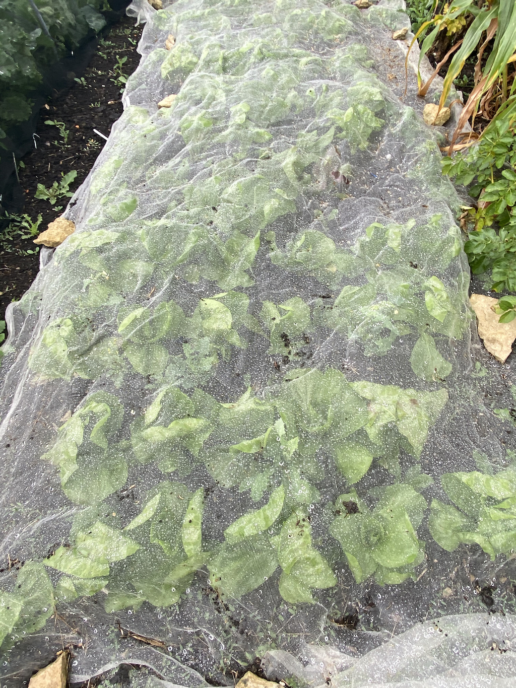 There’s a lot of planting and pricking out to do now. I had to go away for a couple of days during the hottest days and was worried whether these seedlings would survive – the hot temperatures meant that I was watering at least twice a day in the greenhouse, even with the capillary matting. Then I remembered the shading cover that Vegepod had sent me to try out (it isn’t available in the UK yet) and spread it over the seedlings. It was amazing. I got back the following evening, expecting to find a composty graveyard of frazzled plant babies and instead they were lush, green and moist, the capillary matting still damp and they didn’t need watering until the next morning. (Gardening Naturally sell plant shade cloth which might be the same sort of thing.)