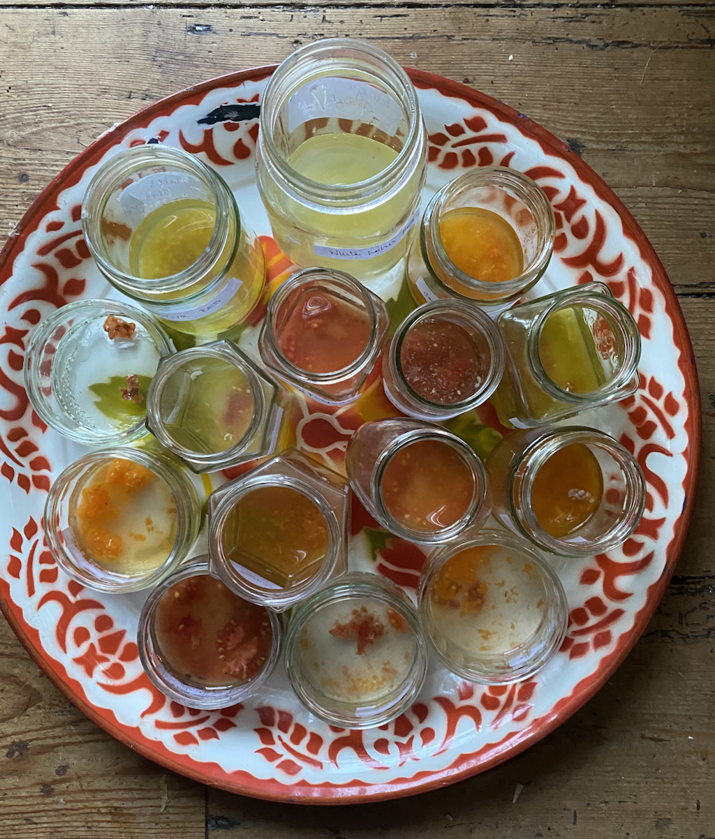 Other seed saving includes a lot of tomatoes (here they are fermenting before spreading on kitchen paper to dry), marigolds, sunflowers and cinnamon vine.