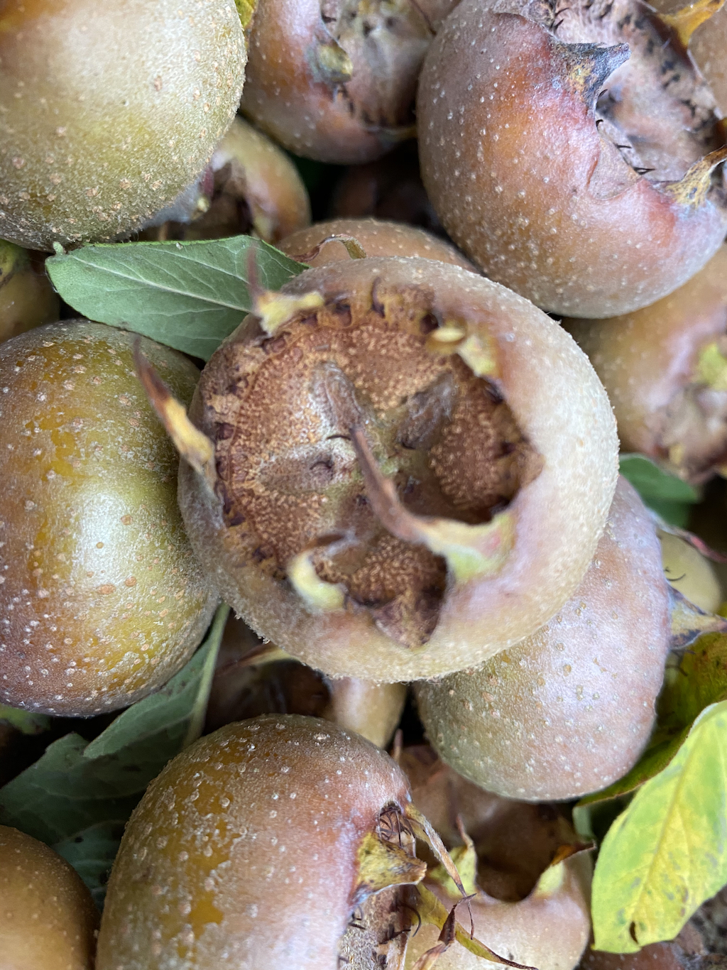 My small potted medlar tree has produced the biggest harvest yet. The medlars are now in the kitchen in a large bowl “bletting”, a maturing/rotting process which makes the fruit sweet and ready for use. I make medlar jelly. When I do, I’ll post the recipe here. The bletting usually takes 3 weeks or so.