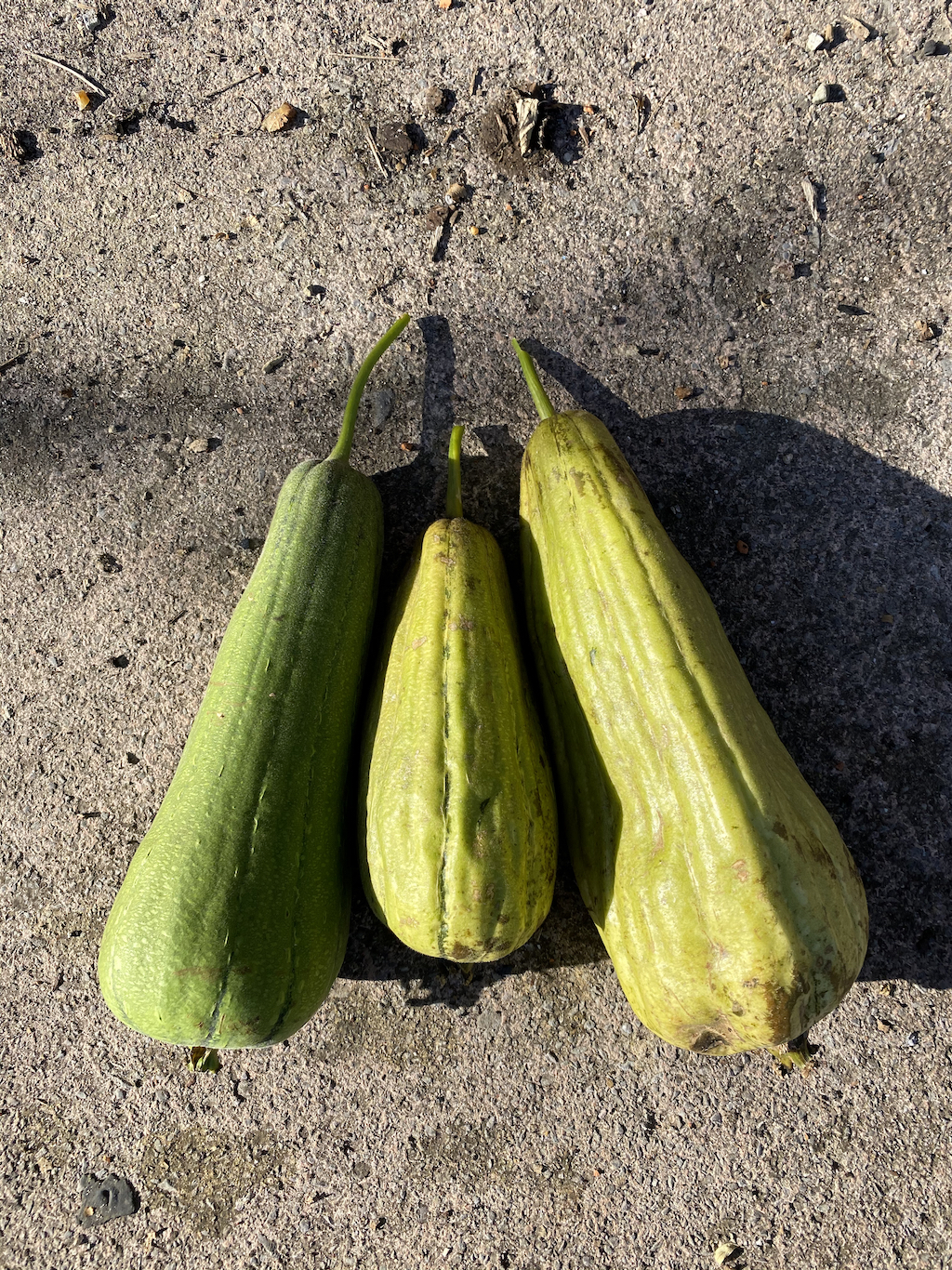 I let the luffas mature on the plant so that the skin changed colour to yellowy-brown, and discovered that this made the skin really easy to peel off, revealing the luffa inside. These are drying and I look forward to using them. I’ve saved the seeds and will find out whether they can be used next year, or if they are likely to have cross pollinated – first year of growing actual luffas (last year the plants were eaten) so I am not sure.Â