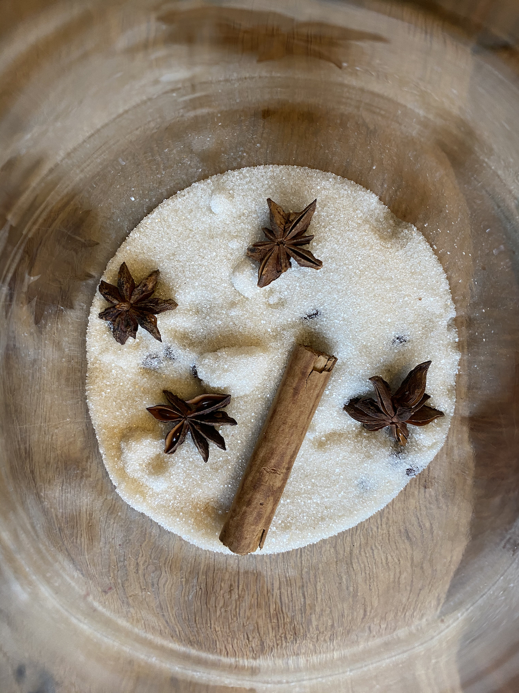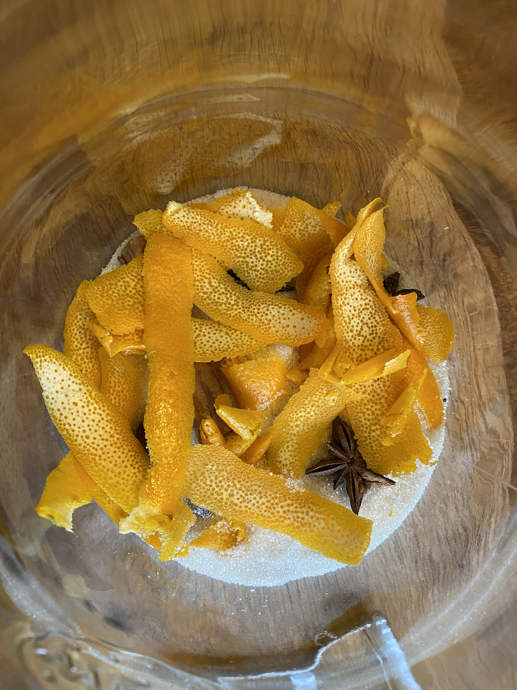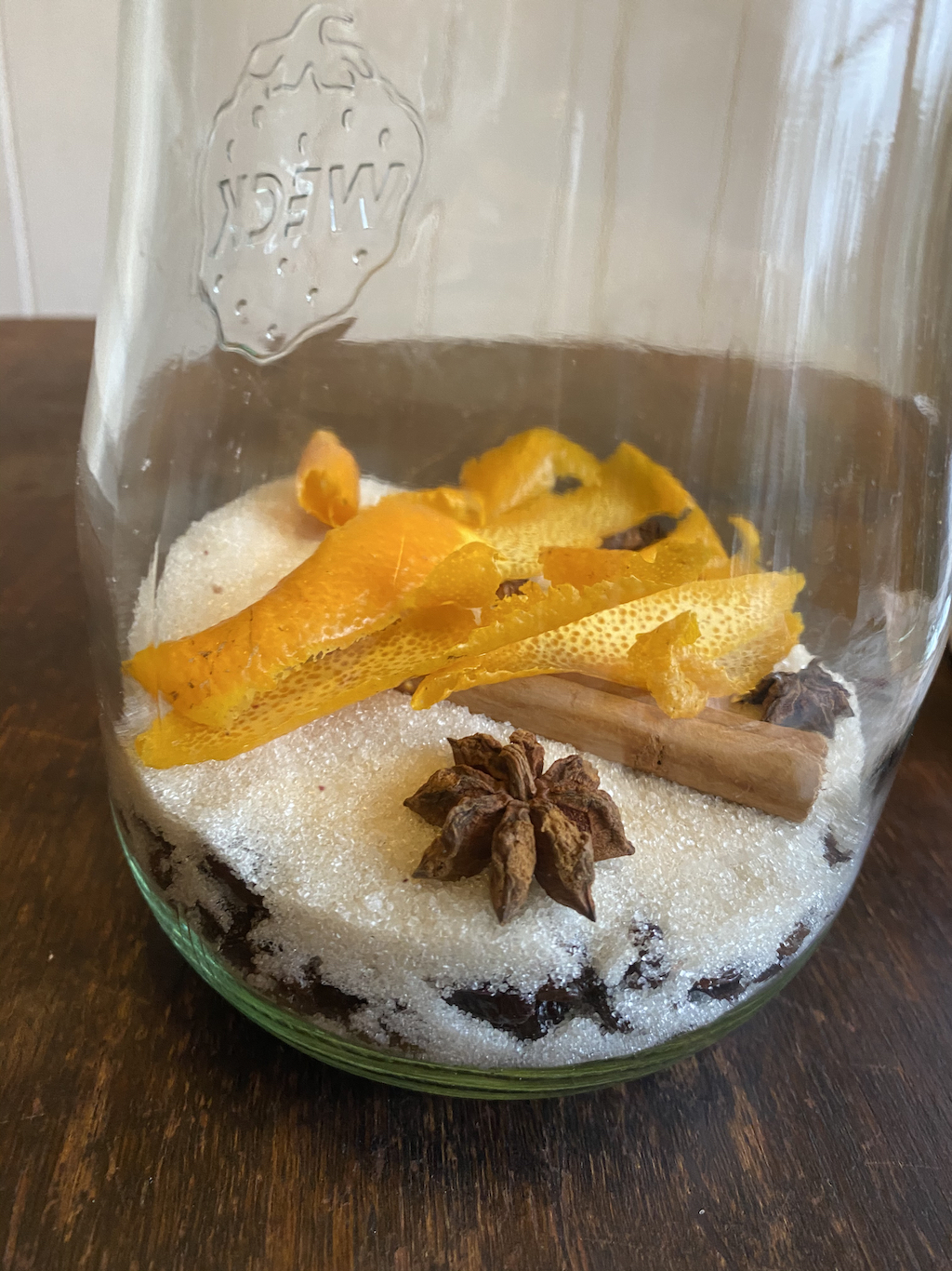 Pour the sugar into the large jar and add the spices and peel.