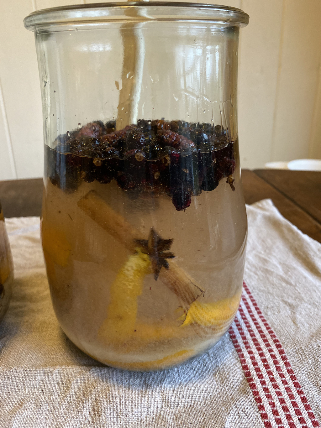 This is some of last year’s spiced vodka. I’ve been using it to soak the fruit in for our Christmas cakes and to “feed” the cakes too.