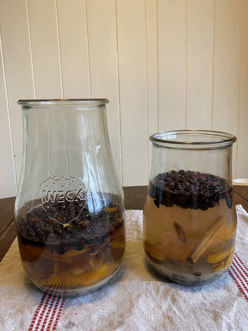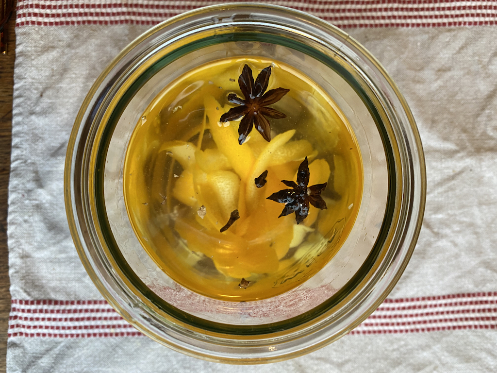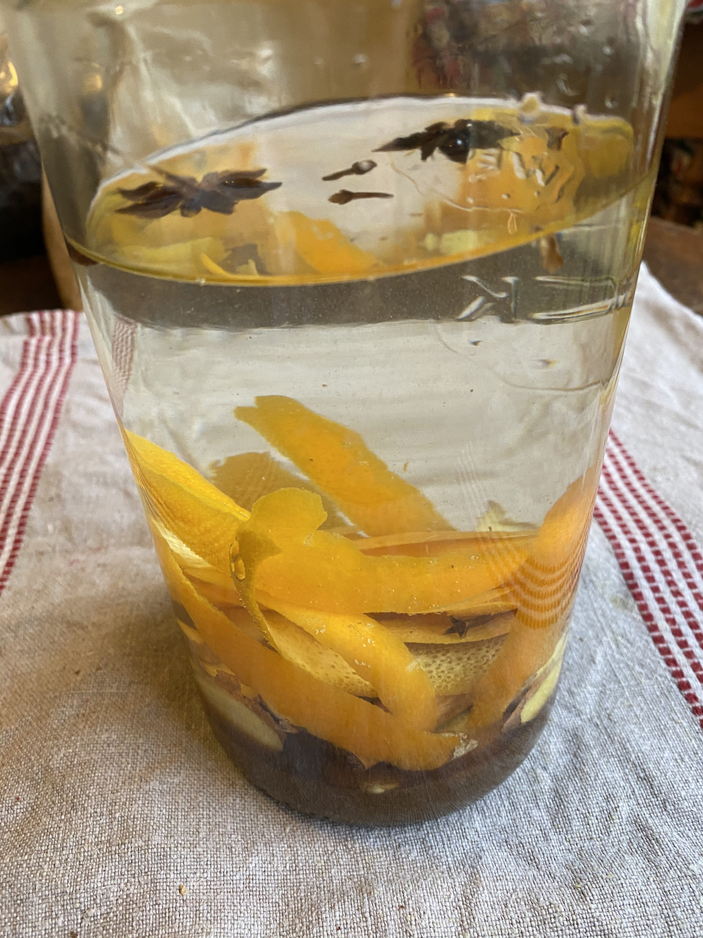 When the liqueur is ready to strain, save the spices and peel. Place in a pan and add water so that the pan is half full. Bring to the boil, reduce the heat and simmer (or pop it on top of the woodburner if you have one). This will fill the room with delicious fragrance!