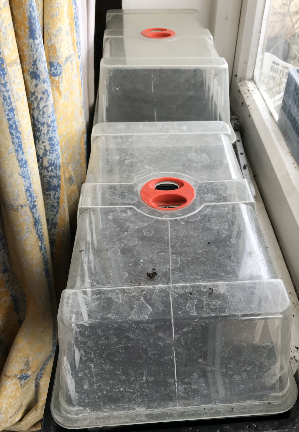 Propagating lids are helpful to maintain a comfortable environment for seedlings, especially if your greenhouse (or growing space) is draughty with holes, like mine. You can upcycle clear plastic containers to make your own.