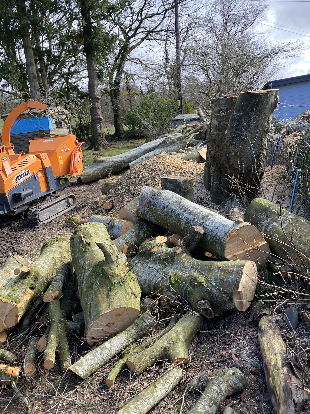Sadly one of the first jobs here was removing seven trees which posed a danger to us, a neighbouring property and the electricity power lines. We now have a lot of wood, wood chip and sawdust – plus three 9 ft high trunks which my children have plans for. My plan is to hang hammocks from them!