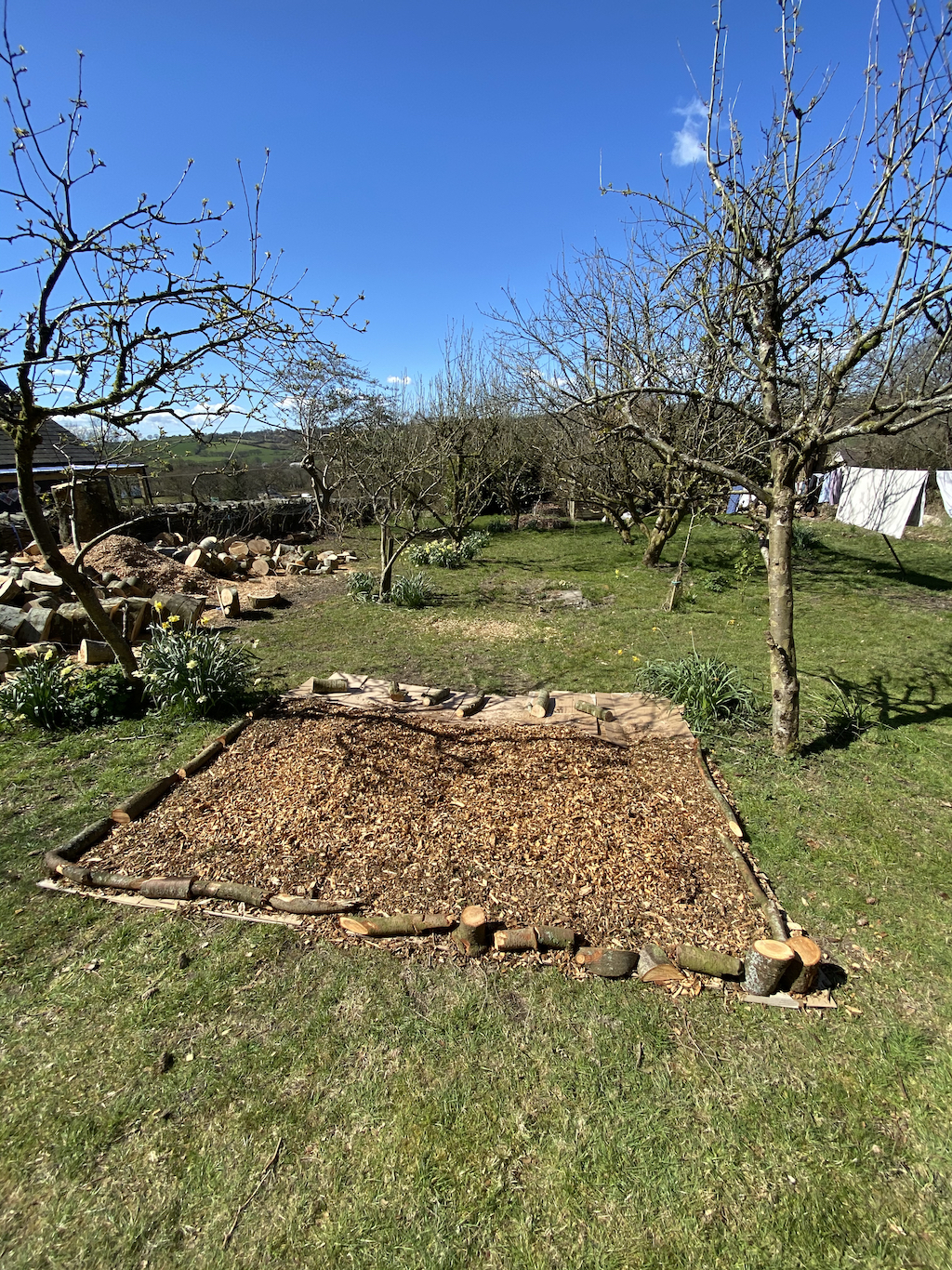 To the side is a triangular shaped garden with a seat made from old logs, which catches the evening sun. An parking area leads to more gravel, which I will put pots and raised beds on to make that area abundant. The back garden has a small greenhouse (hooray!) and a lawn which will become entirely no dig beds. A gate beside the greenhouse leads to the orchard, with some established fruit trees and bushes. In the orchard I’ve started to make new beds, using different kinds of mulches (one of these has asparagus in), will plant the fruit trees and bushes I brought with me, and in August a polytunnel is arriving. The top part of the orchard will be the family area, where we can eat, camp, have fires and welcome friends.