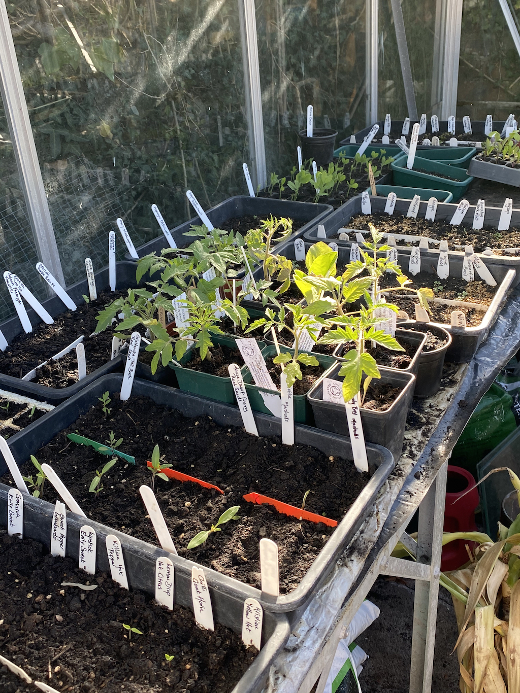 The greenhouse is full of seedlings, and I am sowing more today! It is a very exciting time. Things are a bit different this year. The greenhouse is half the size of my old one and I do not have a polytunnel, so I won’t be growing the same number of varieties of warmth loving plants as usual – just a few aubergines, chillies, peppers, melons etc. There is always next year!