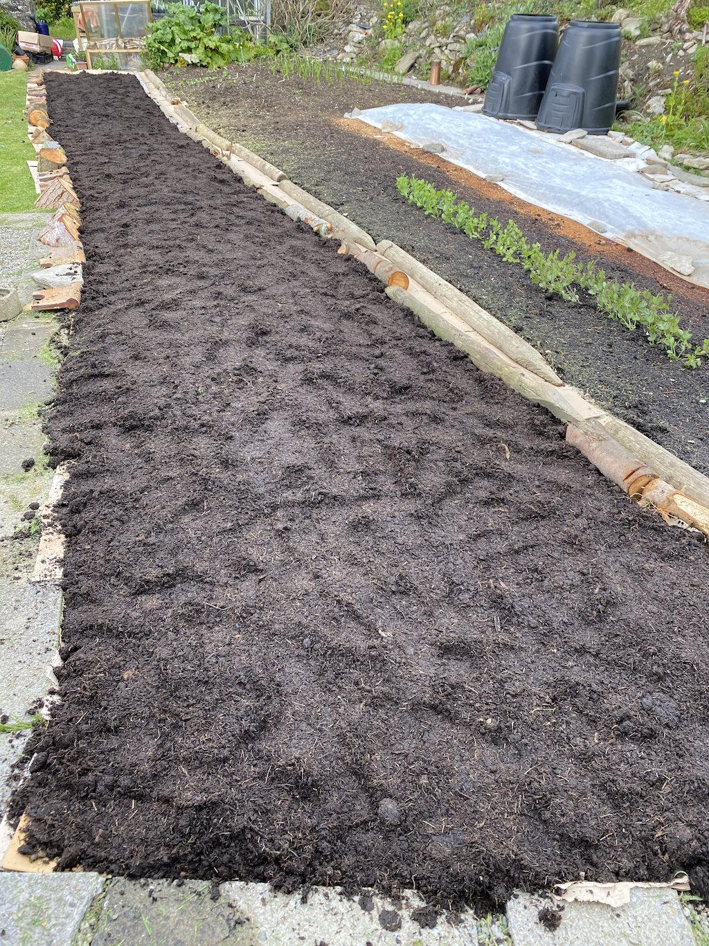 I am making beds to cover the whole of the back garden, except for the patio area near to the house (where the compost sacks are). There is a small veg patch made by the previous owners, which is being mulched with just compost.