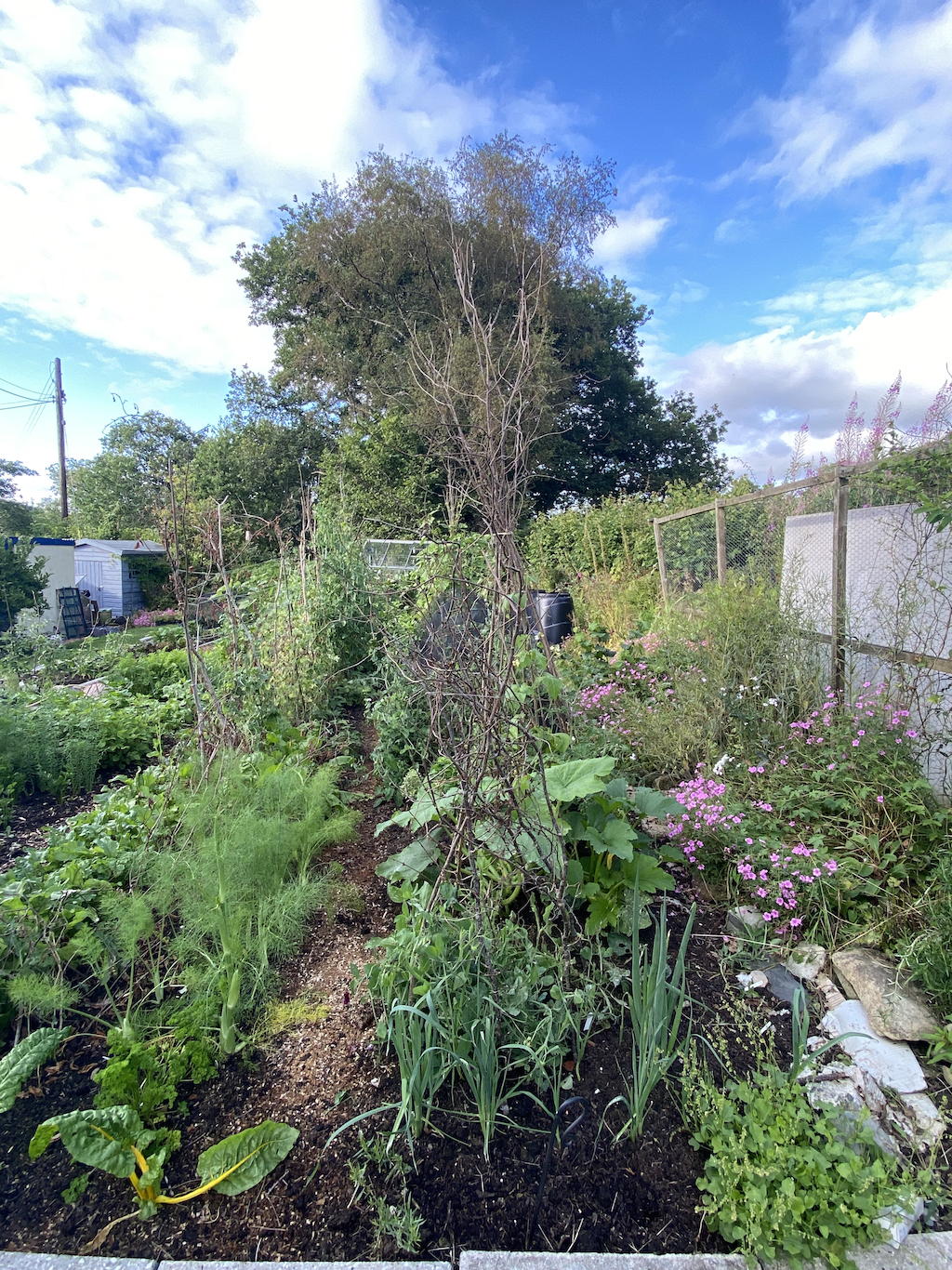 I’m very happy with the wild area on the left hand side in the photos, especially the magnificent willow herbs. Really good for wildlife. (The strange grey box houses the oil tank. I’ll paint it a more subtle colour one day.)