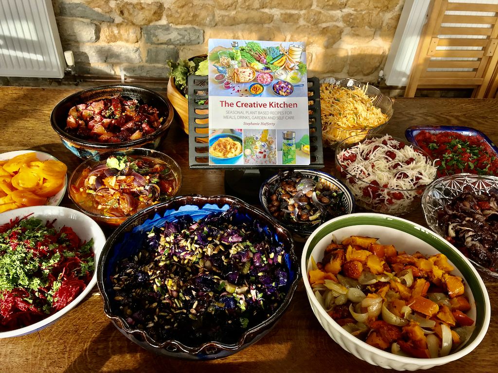 This hummus was always hugely popular on the lunches I made, when I was the chef for Homeacres courses, which I co-ran. They were real adventures in seasonal cooking! I never knew until the morning what ingredients I would have for the day’s feast. Having grown a large herb garden for years, I always brought bunches of seasonal herbs from home too. It was great fun and I do hope to do something similar here in Wales in the future. Many of the recipes for the food I made on the courses are in my book The Creative Kitchen, which is filled with seasonal plant based recipes using many ingredients you can grow in your garden.