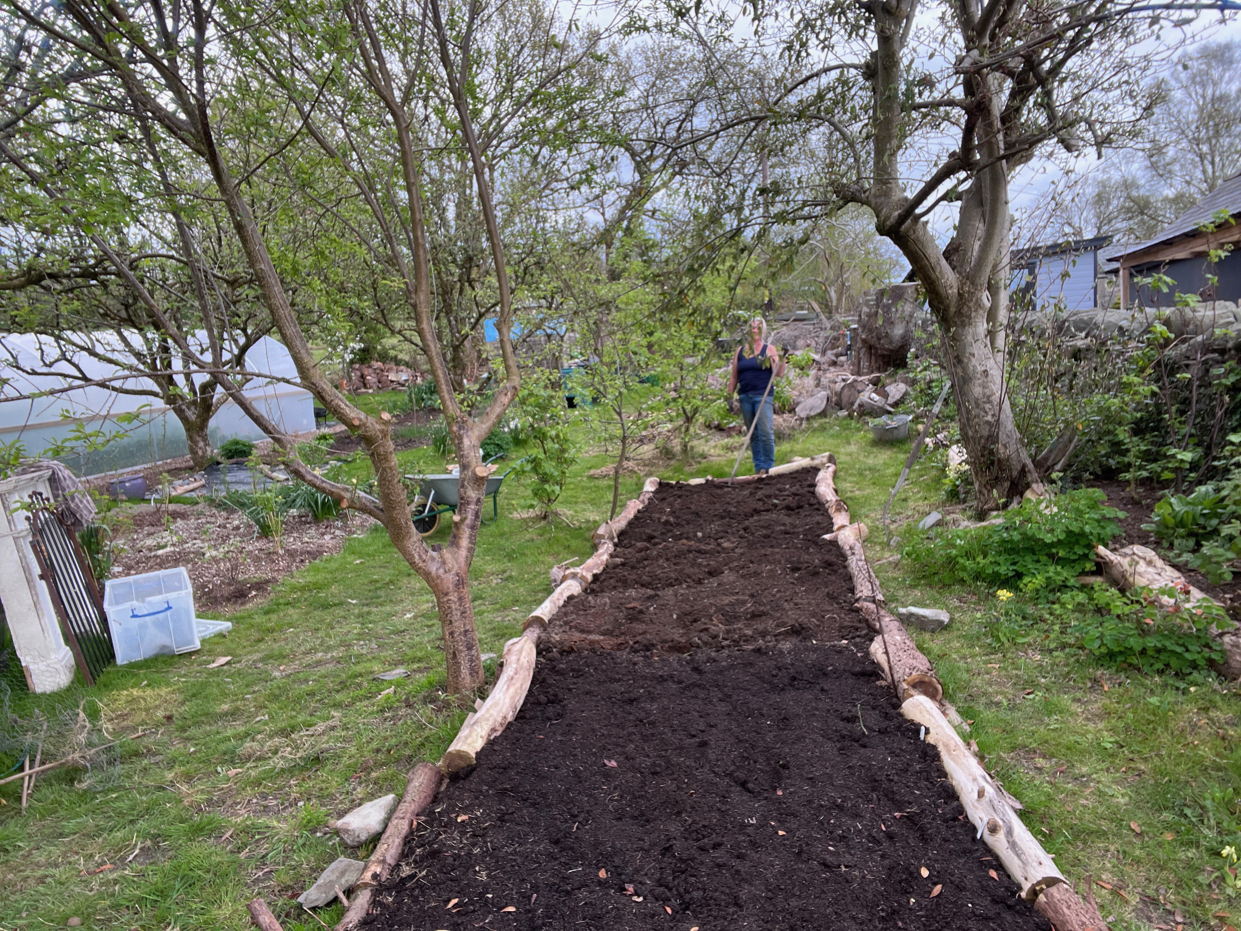 In another part of the orchard, I made a new asparagus bed – see how here on my You Tube channel – and then a few weeks later a new potato bed, using different compost mulches to see how they compare. These beds have temporary wooden sides made from logs that we have in the orchard, from some trees being cut down by the electricity company a few years before we moved here.