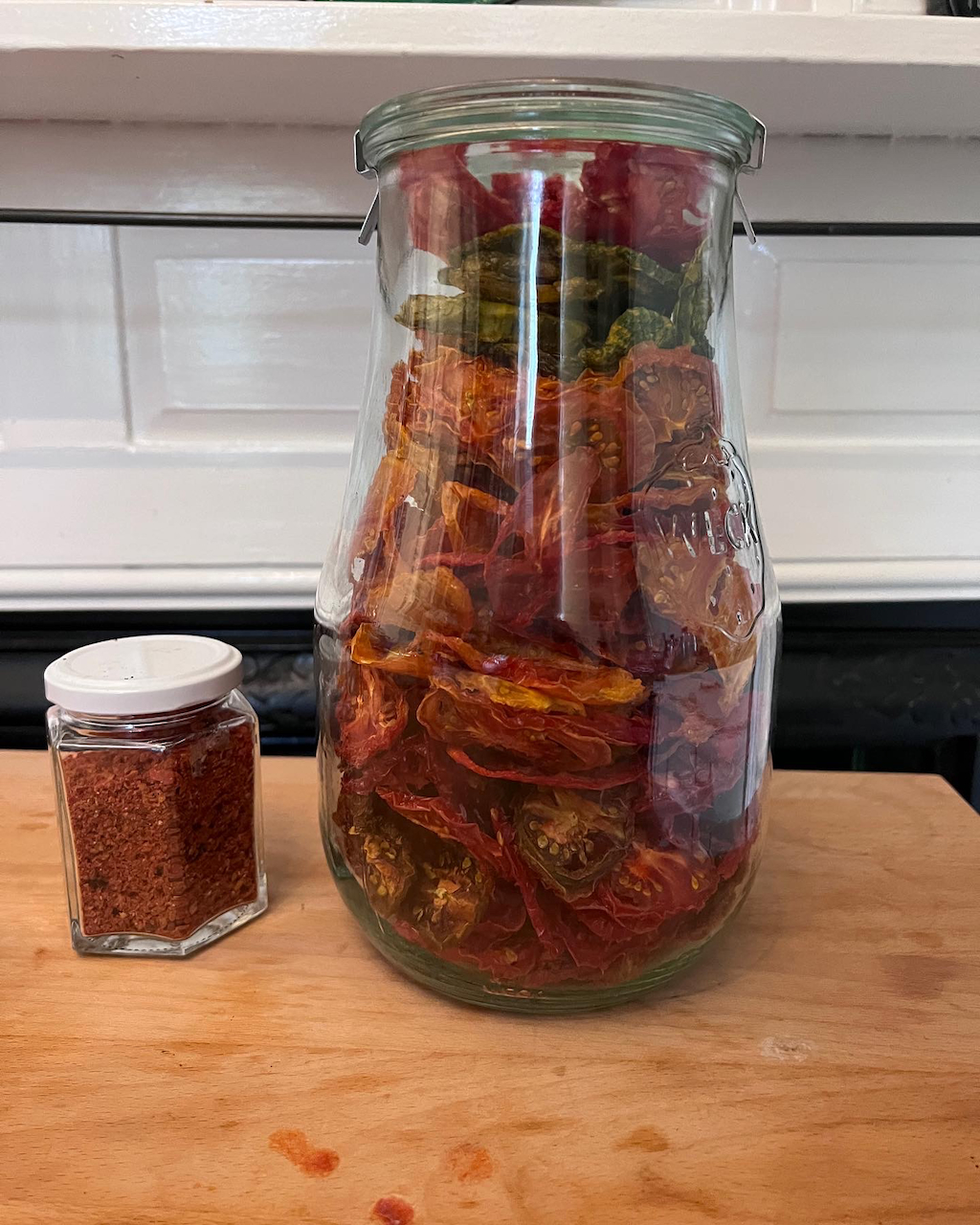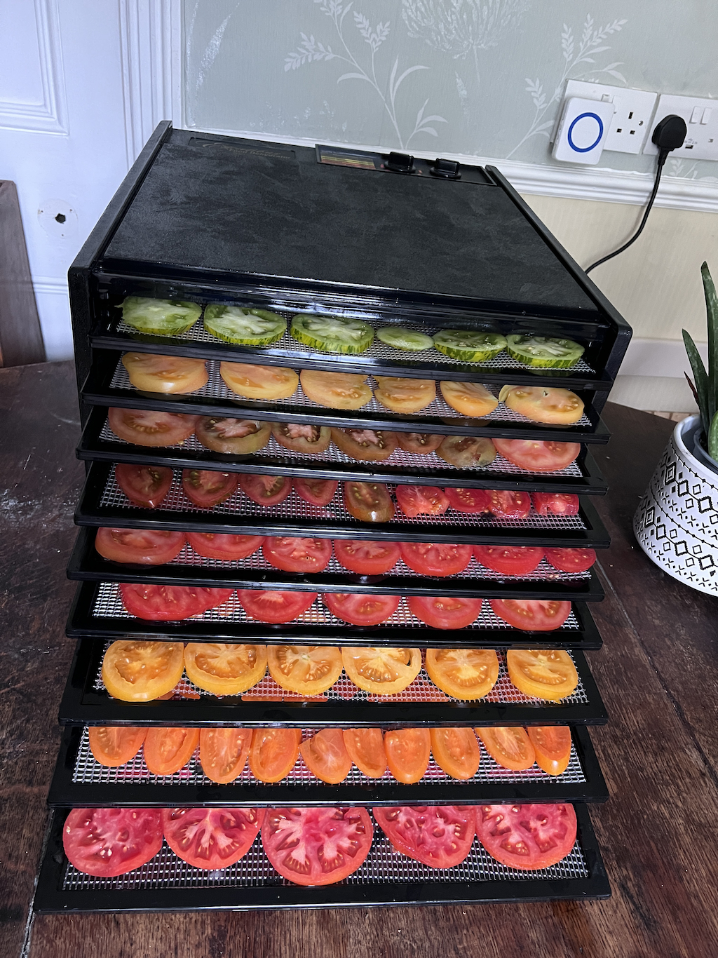 Most of the autumn harvesting has finished now, and I am preserving and storing the last crates of apples, tomatoes and cucumbers. Dehydrating is a favourite way of preserving tomatoes. Once dry they are so easy to store: simply put the dried tomatoes in clean, dry lidded jars and store out of direct sunlight. (I don’t store in oil: that’s trickier and any mistakes can cause botulism.) Some of the dried tomatoes are ground up (I use an attachment to a hand held blender) and stored as tomato powder. This is very versatile, used in sauces, soups, pates and other dishes to add a rich tomato flavour. Mixed with sea salt, tomato powder makes a great sprinkle and rub for roasted vegetables. Recipes for dehydrated veg and fruit are in my book The Creative Kitchen.