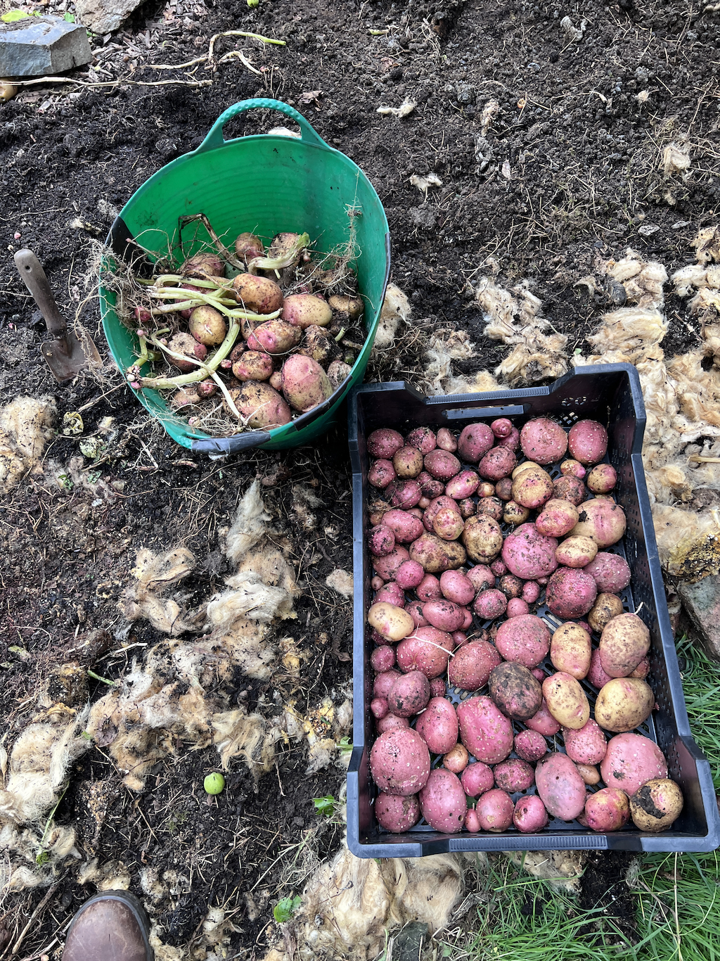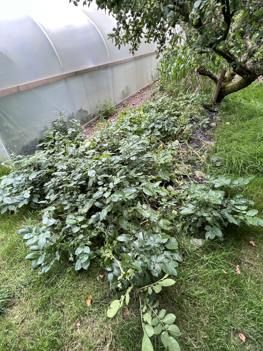 Towards the bottom of the garden, I decided to clear this weedy area – full of grass and creeping buttercup – using an old plastic sheet and potatoes. Holes cut through the plastic allowed the potatoes leaves to grow, whilst the tubers formed in the soil underneath. The main purpose of the bed was to clear new ground and it did an excellent job. I also obtained a good potato harvest, losing some to slugs and rodents.