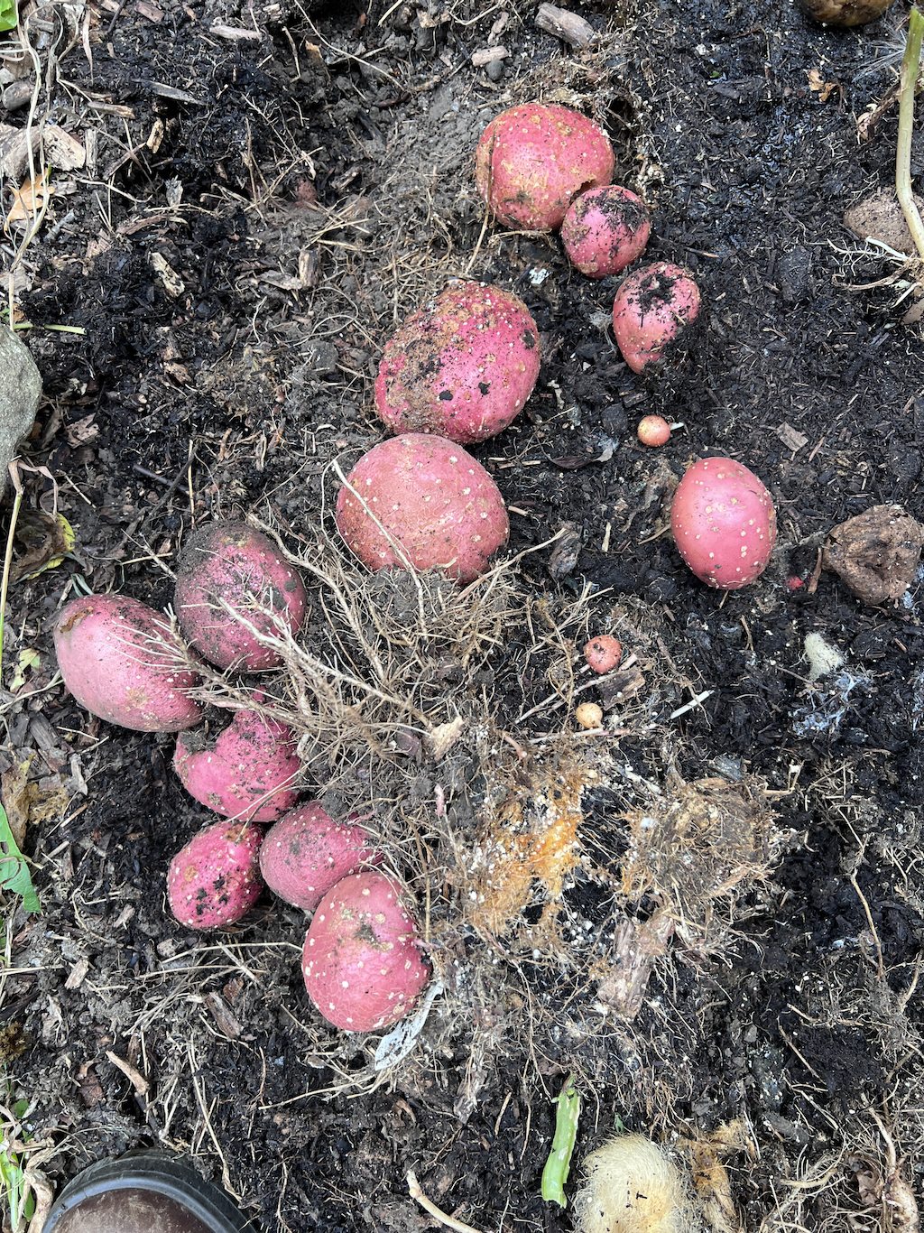 The elephant garlic is at the front of this photo. There’s a dish of baby elephant garlic, mono bulbs and cloves. The mono bulbs will produce the biggest garlic bulbs, and the cloves will either produce bulbs or mono bulbs. I am planting the babies into pots for planting out later on.