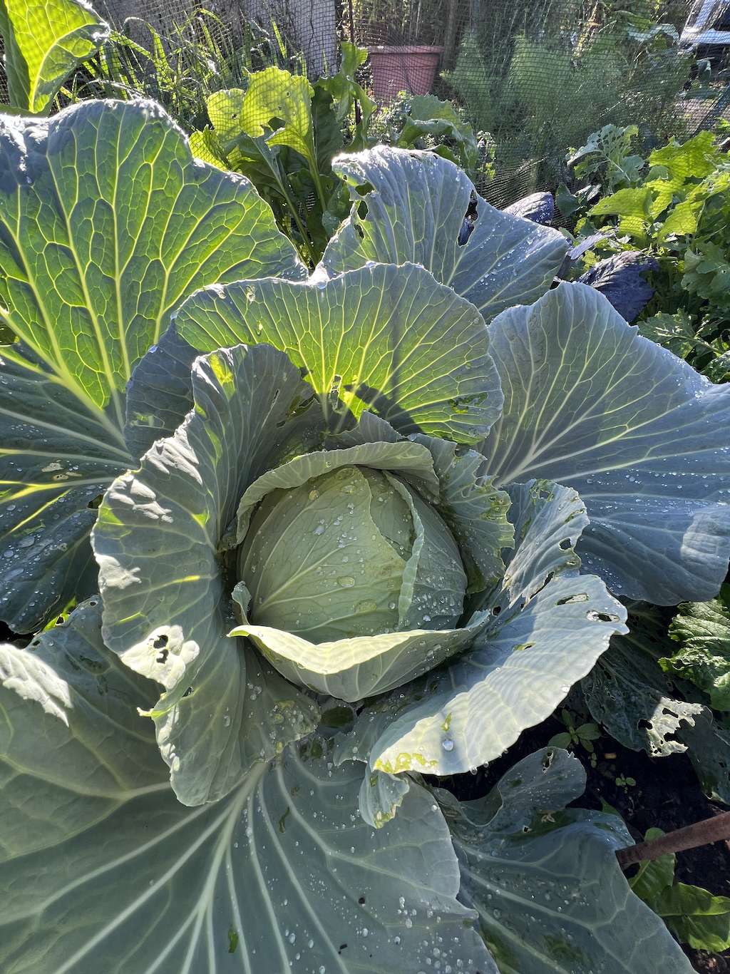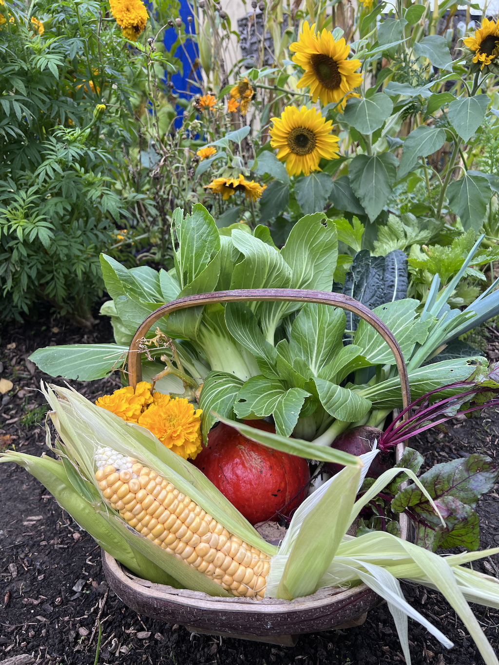 After the recent storms, most of the garden is fine, but some plants have been flattened, including sunflowers, cosmos and some of the bean frames – I’d already harvested the beans but hadn’t got round to removing the frames yet, so nature lent a hand! Quite a few of the winter brassicas are reclining and need a helpful stake to put them back in an upright position.
