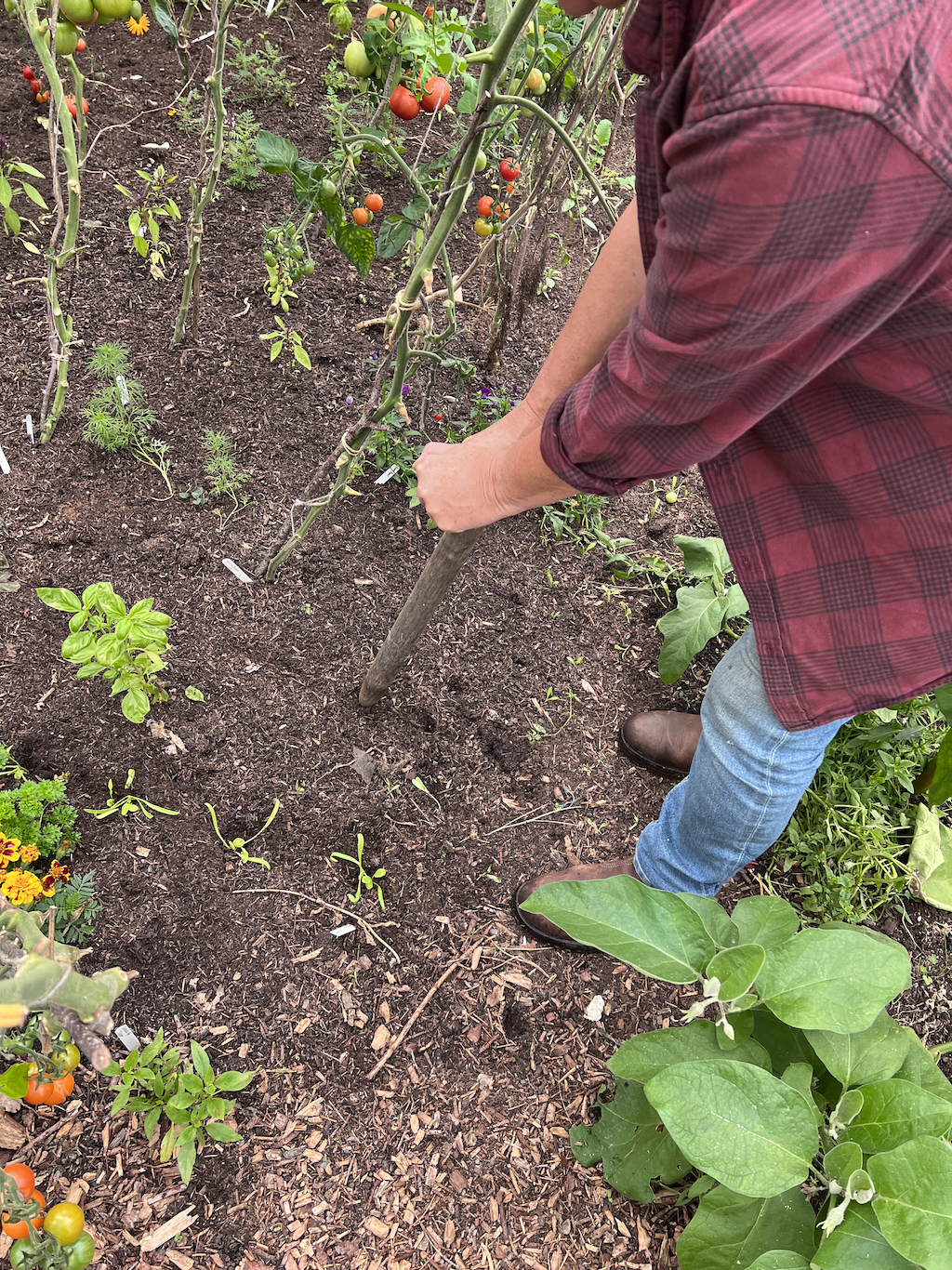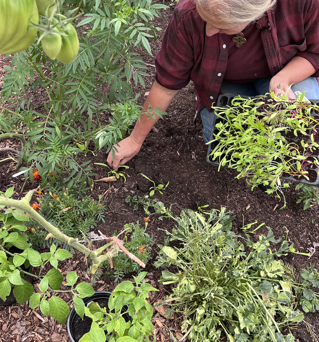 Steph on the bed cleared by plastic and potatoes, now with a green manure cover crop