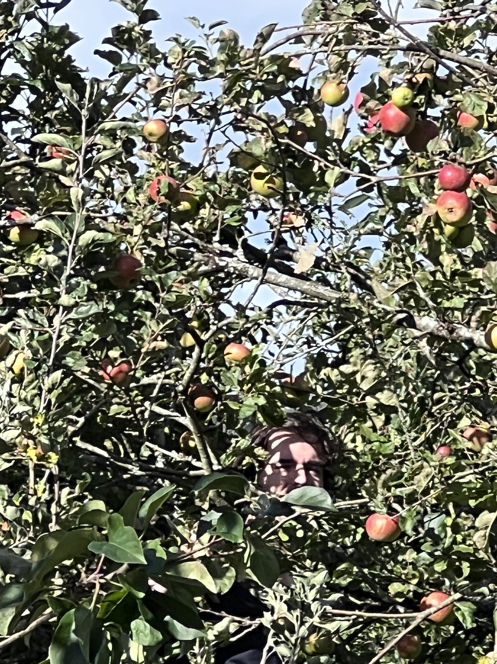 There have been apples in abundance this year, a real treat after the smaller harvests last autumn (which were mostly eaten by squirrels, jays and magpies!) I did not plant the established apple trees, have no idea what they are, and have enjoyed the discovery of how the apples taste and cook. Aided by my son Theo, home now from university (can you see him in the tree?) we have harvested boxes of apples to store, and more boxes of windfalls to use sooner in preserves and meals. Apple crumble is a real favourite here.