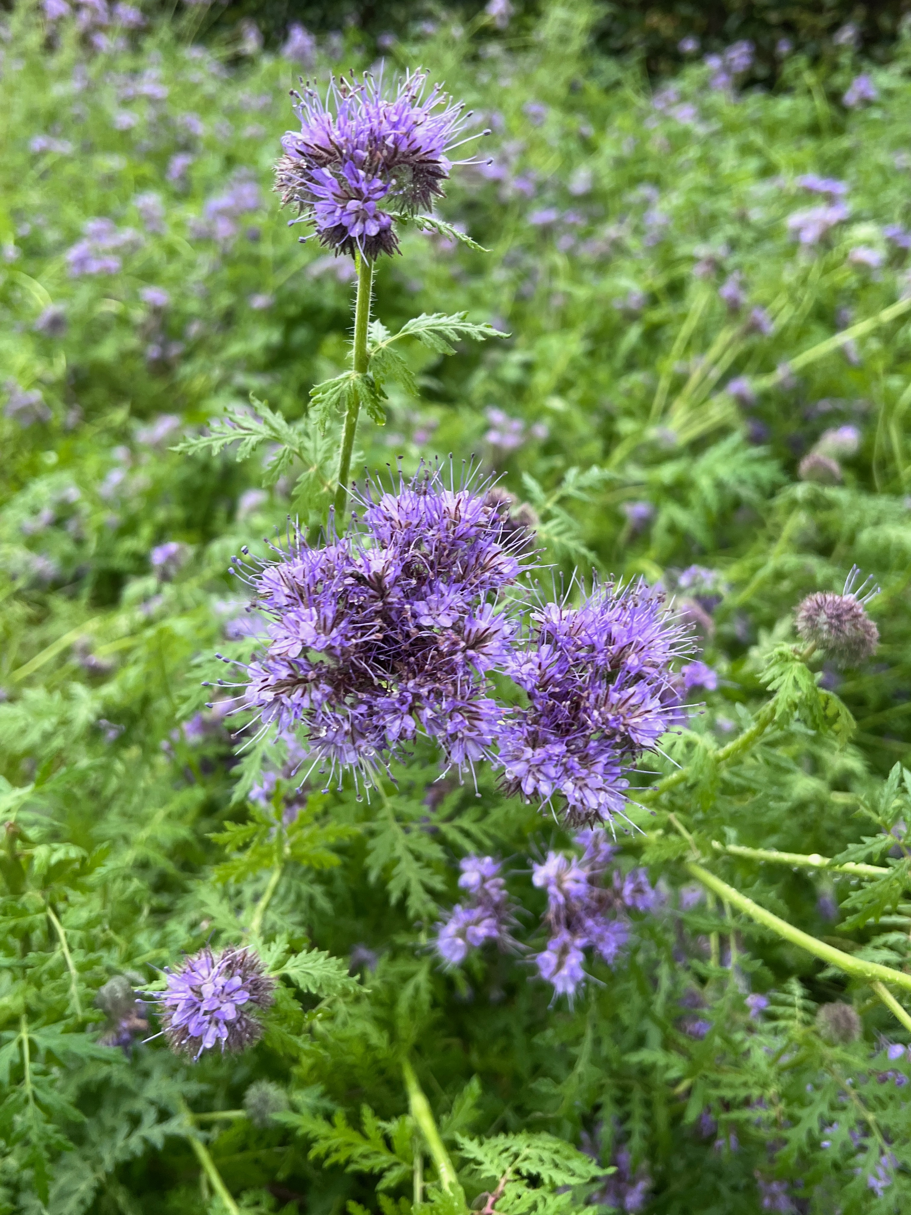 Every year I experiment with different combinations, to discover what works well. I sowed green manure in a newly created asparagus bed to increase biodiversity and protect the soil from weed seeds blowing in, choosing phacelia which would not compete with the establishing asparagus roots. This quickly covered the bed, the distinctive purple-blue flowers providing forage for insects and, during periods of extended dry weather, helped to protect the soil from moisture evaporation.